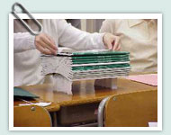 学生全員が持っている講義概要を重りにして作品の上に載せていき、どの位の重さまで耐えることができるのかを各自が実験してみる。
