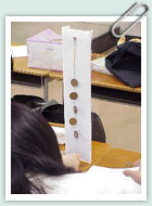 重りをかける位置や材料も変化させてみる。実験結果に基づいて材料の曲がりにくさの係数(断面2次モーメント)などを算出し、理論的な裏付けを定量的に理解する。 |