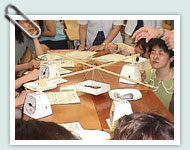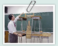 講義テーマとリンクしたビジュアルな教材を並行して見せ、刺激を与えることが必要である。テーマに沿ったビジュアルな教材とは、実際の美しい建物のスライドや写真のこともあれば、一連のストーリーをもったビデオのこともある。たとえば「力と形」の授業では、机の上でできる簡単な実習をしながら、同時に実際の建物への応用がどのようになされているかをスライドやビデオで理解するといった即時的な切り替え手法を多用している。 |