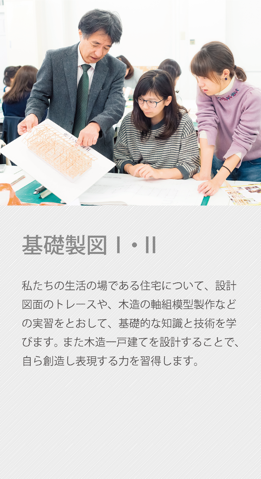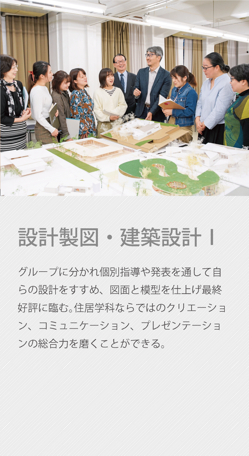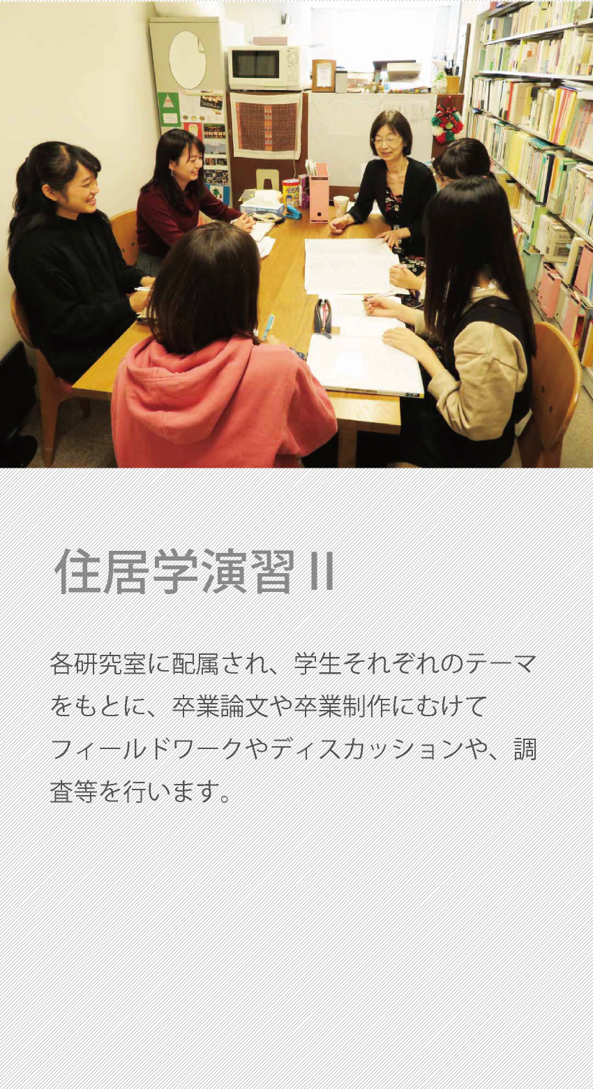 住居学の基礎となる知識や技術を身に付ける授業が主となります。