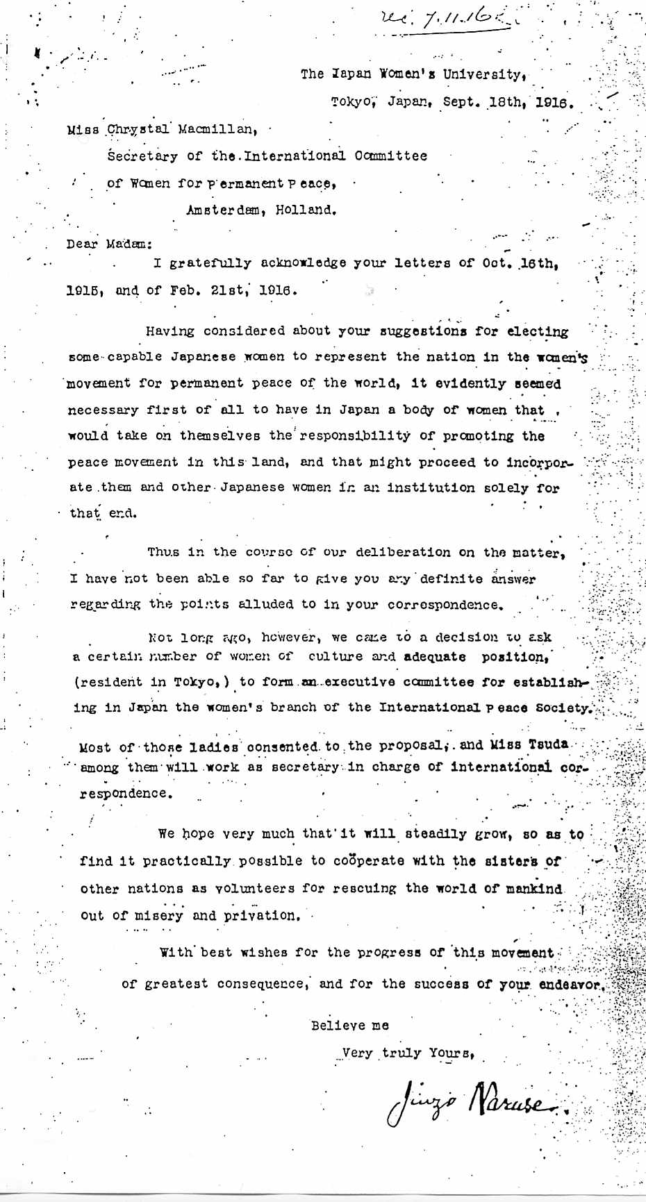 成瀬仁蔵の1916年9月18日付けクリスタル・マクミラン宛書簡