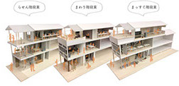 私たちは洋装店を営んでいた木造三階建ての長屋を担当しました。店をたたんだ後もこの家に住み続けている大家さんの住宅部分を除いた、商店街に面する前面の居室をオフィスに転用します。デリーブ調査で得た情報を踏まえ、街とオフィスの関係性をどのように設定するかなどを考慮しながら提案を形にしていきました。階段の配置の仕方や街への開き方の異なる、「らせん階段案」「まわり階段案」「まっすぐ階段案」の3つの提案が生まれました。この空き家のプロジェクトをきっかけに、富士吉田の魅力をより多くの人々に知ってもらえるような活動につなげていきたいと考えています。