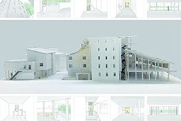 本提案では、外界とのつながりが希薄で都市が他人事になりやすい現代において、いま私がいる〈ここ〉を感じることと、時たま他者のいる〈そこ〉に対して〈ここ〉を感じること、この感覚に行き来によって、都市が誰かにとっての〈ここ〉のつながりで形成されていることを認識できるような建築を目指す。都内の公園と川に挟まれた住宅地に、敷地内外で相互に〈ここ〉〈そこ〉の関係性を見出しながら老人ホームやインキュベション施設を備えた複合用途型の集合住宅を提案する。周辺環境に基づいた様々な原理の縫い合わせによって構成される全体は、多重人格的でありながら、それぞれの〈ここ〉にいる感覚が連なることで、私と都市の中の誰かを意識の中でつなげることを期待する。