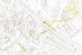 敷地として選定した北区王子駅周辺は、自然地形や人工物により分断されており、体験の断片化がまちの捉えにくさを生んでいる。さらに駅西側に点在する北区庁舎は築50年以上が経過し、建替計画が持ち上がっている。そこで既存の分棟庁舎の改築、駅ロータリーの拡張、新庁舎の増築を計画する。王子駅周辺の体験の断片をひろいながら人の動きに呼応する曲線状の道でつなぎ直し、立体的に交差する約800mの風景をまちに重ねていく。