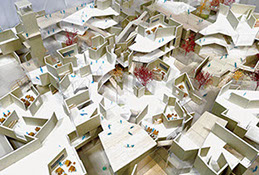 設計段階では、自身の原風景であるベネチアの都市を参照してスケールを調整した。さらに、敷地周辺のコンテクストから読み取ったグリッド上に、壁の操作によって無数の『感傷主義的空間』をシワのように織り込んで配置し、全体を構成した。