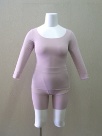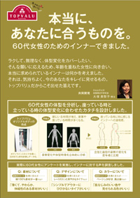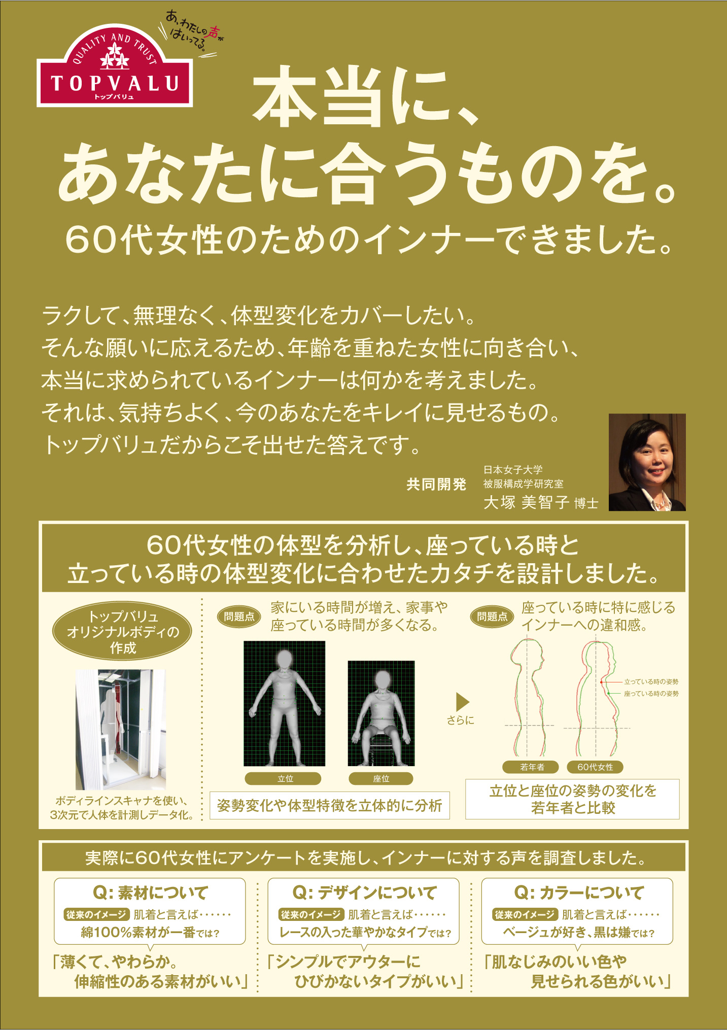 シニア女性向けインナーのフィット性の向上のために、60歳代女性の体型と姿勢を分析し、60歳代女性の平均形状を持つ団塊世代標準ボディを基に、女性用インナーを作成しました。 姿勢別体型分析により、60歳代以上は立位と座位で体型が大きく変化し、前傾姿勢になることから、腹部の突出が大きいことが明らかとなりました。この結果をもとに、ガードルはウエスト部分を幅広に、鼠径部には伸縮性のある生地を使用することで、座ったときの腹部の圧迫を軽減することが確認されました。