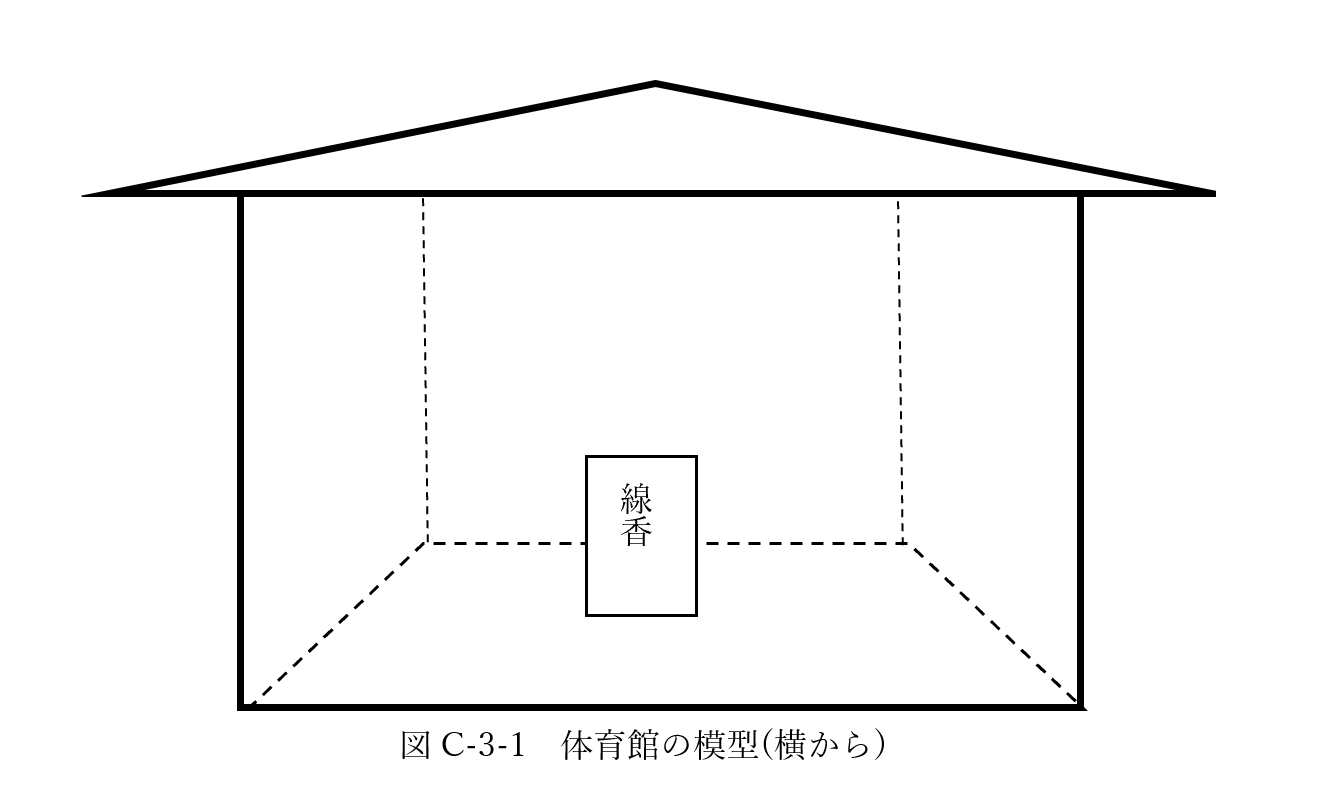シミュレーションを平面(2次元空間)で行ったので、立体的な空間(3次元)で行えるようになりたい。今回は人間の動きを考慮に入れず実験を行ったので、運動をしている時の体育館での測定も行いたい。また、実験AからDに共通して風やドアから遠い中央部分の状態を正確に測定、観測することができなかった。今後は体育館の中央部に特化した測定も行いたい。