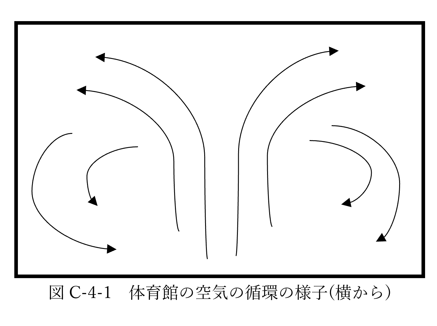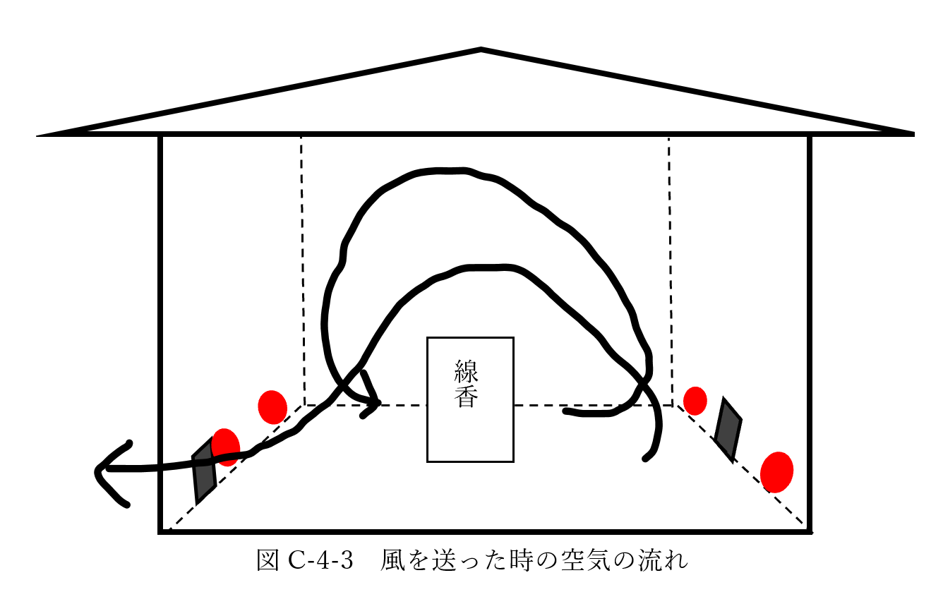 まず、体育館を密閉して煙を充満させてから実験を行った。送風機の位置から、風を送り始めると、下からの風により、煙が瞬間的に上に押し上げられた。その後、密封していた時と同様な循環する煙と、向かいのドアの穴から流れ出る煙の、2つの煙の流れの様子が観察された。(図C-4-3参照)