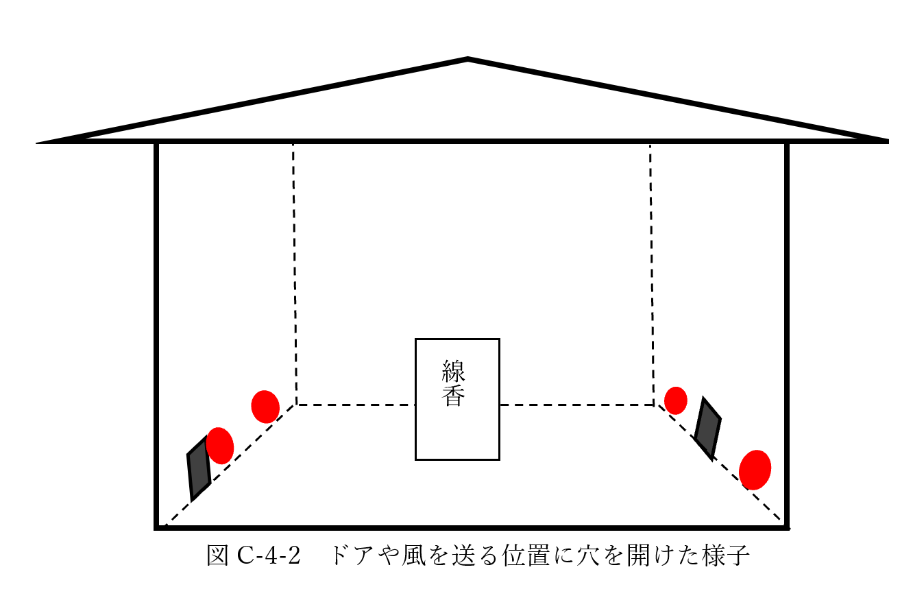 つぎに、図C-4-2のように、体育館のドアの位置と、送風機を置いた位置に穴を開け、空気(煙)の流れを見た。図中の、黒四角は体育館のドアを、赤丸は、送風機の設置場所を示す。丸くあけた穴からは小型扇風機で風を送った。