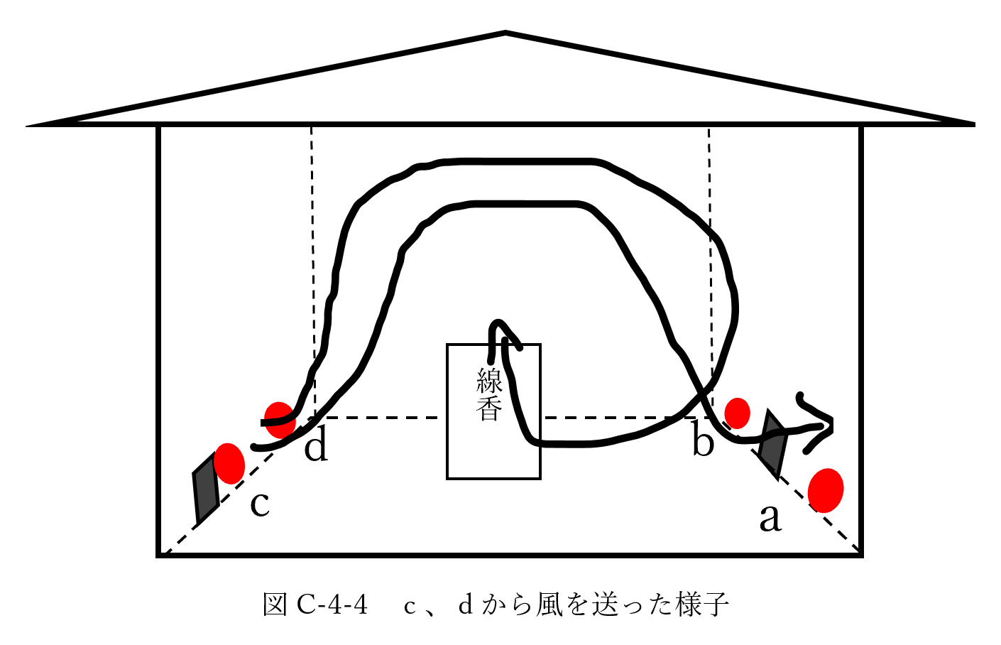 最後に、4か所の送風機からの風がそれぞれどのような動きをしているのかを確認する。そのため、他の3か所の穴を閉じて、1か所からのみ風を送って、煙の流れを観察した。送風機の番号は図C-4-4にあるように、図の右手前から奥に向かってa、b、左側手前からc、dと設定する。 結果として、どの位置から風を送っても、図C-4-3のように、向かいにあるドアから風が吹き抜ける様子と外に抜けなかった風が、模型の中を循環する様子は見えた。しかし、それぞれの違いを見ることができなかった。送風機a、bの位置から風を送ったときは、図C-4-3のようになり、送風機c、dの位置から風を送ったときは図C-4-4のように観察できた。