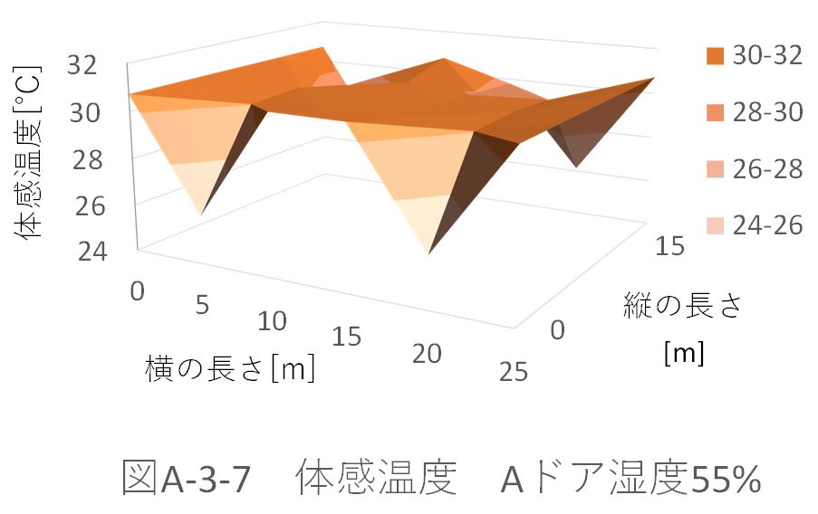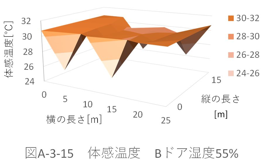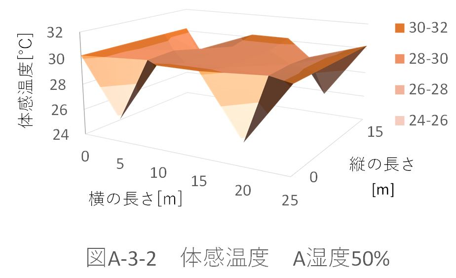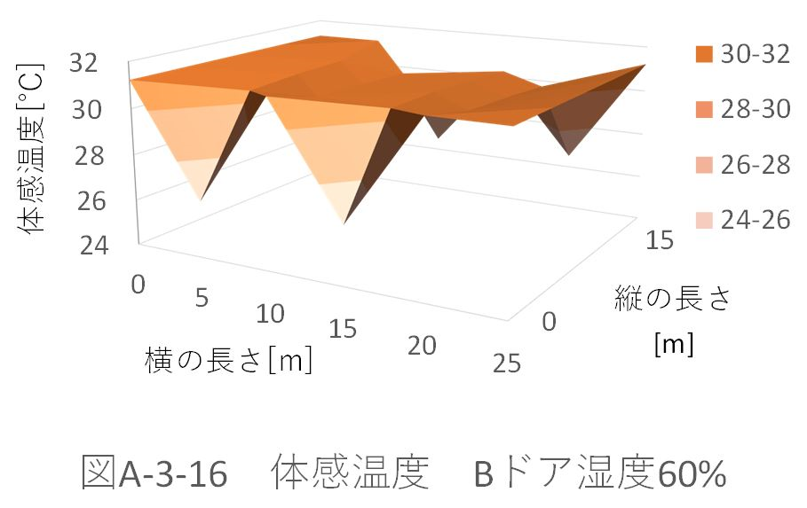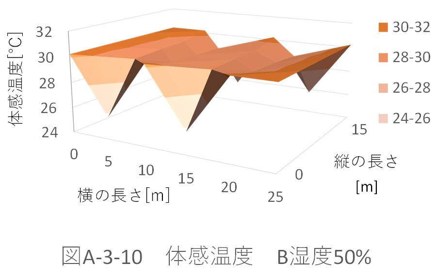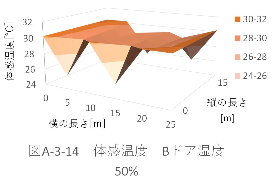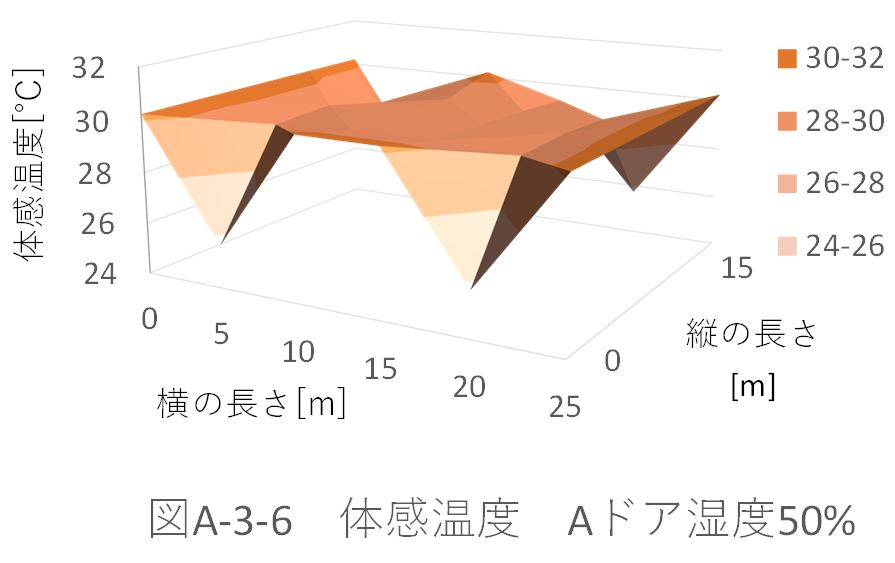 また、湿度50%のときのパターンA、B、Aドア、Bドアの体育館全体の平均体感温度を比較すると、 パターンA:29.39622℃ パターンB:29.39328℃ パターンAドア:29.32945℃ パターンBドア:29.33262℃ だった。 ドアからの風速がない場合、パターンBの配置では、全体の平均体感温度が約0.003℃下がった。これに対し、ドアから風速がある場合、パターンAの配置の方が約0.003℃下がる。 ドアから風速(5m、6.5m)がある場合を比較する(図A-3-5、図A-3-13)。「パターンBドア」の方が、全体に風が循環している。しかし、「パターンAドア」の方が、全体の平均体感温度が下がってる。これは、体育館位置(縦:5m、横:5m)での温度が極端に下がっているためであると考えられる。