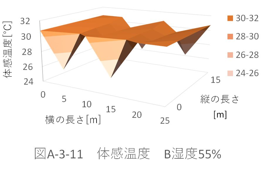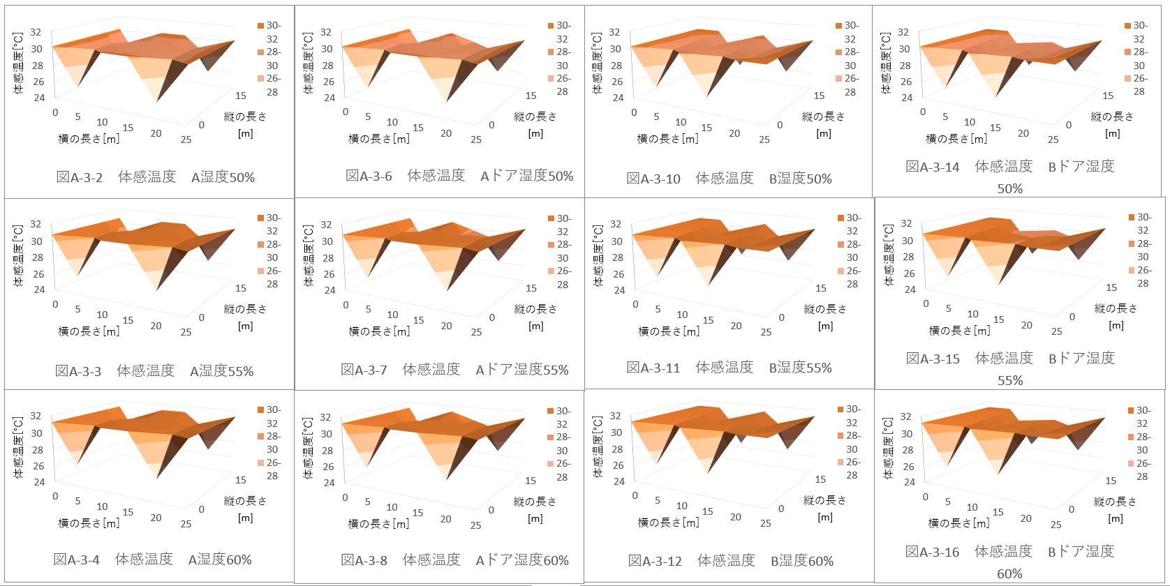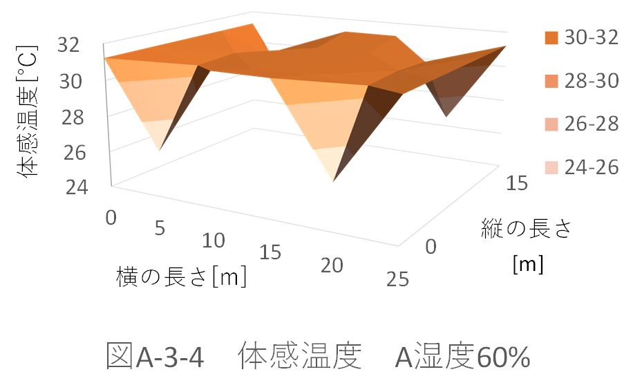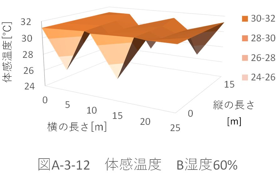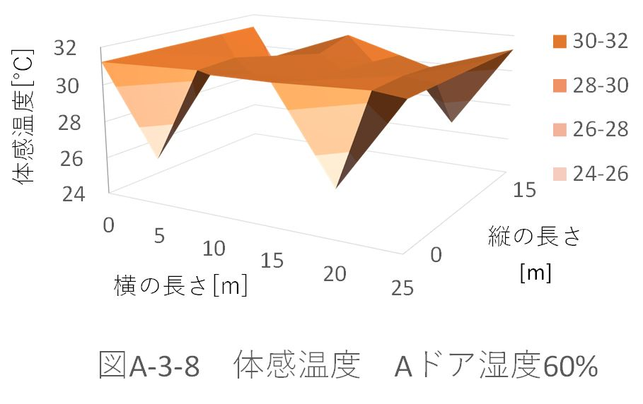 また、湿度50%のときのパターンA、B、Aドア、Bドアの体育館全体の平均体感温度を比較すると、 パターンA:29.39622℃ パターンB:29.39328℃ パターンAドア:29.32945℃ パターンBドア:29.33262℃ だった。 ドアからの風速がない場合、パターンBの配置では、全体の平均体感温度が約0.003℃下がった。これに対し、ドアから風速がある場合、パターンAの配置の方が約0.003℃下がる。 ドアから風速(5m、6.5m)がある場合を比較する(図A-3-5、図A-3-13)。「パターンBドア」の方が、全体に風が循環している。しかし、「パターンAドア」の方が、全体の平均体感温度が下がってる。これは、体育館位置(縦:5m、横:5m)での温度が極端に下がっているためであると考えられる。