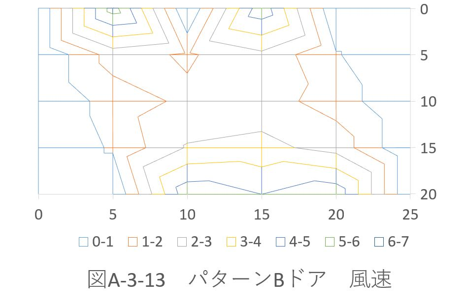 図A-3-13より、ドアから風が吹いていた場合、送風機とドアからの風量が増え、等高線図の面積が増えていることがわかる。これは図A-3-14~6の体感温度の分布も同様の傾向が見られる。