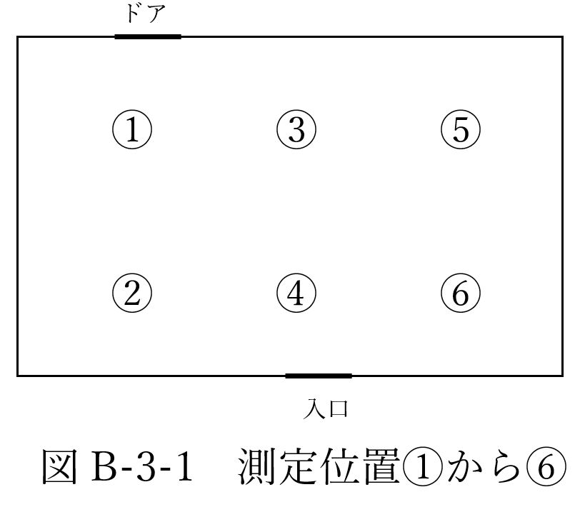 体育館に図B-3-1のように温湿度計を配置し、5分毎に温度、湿度、風速を測定した。