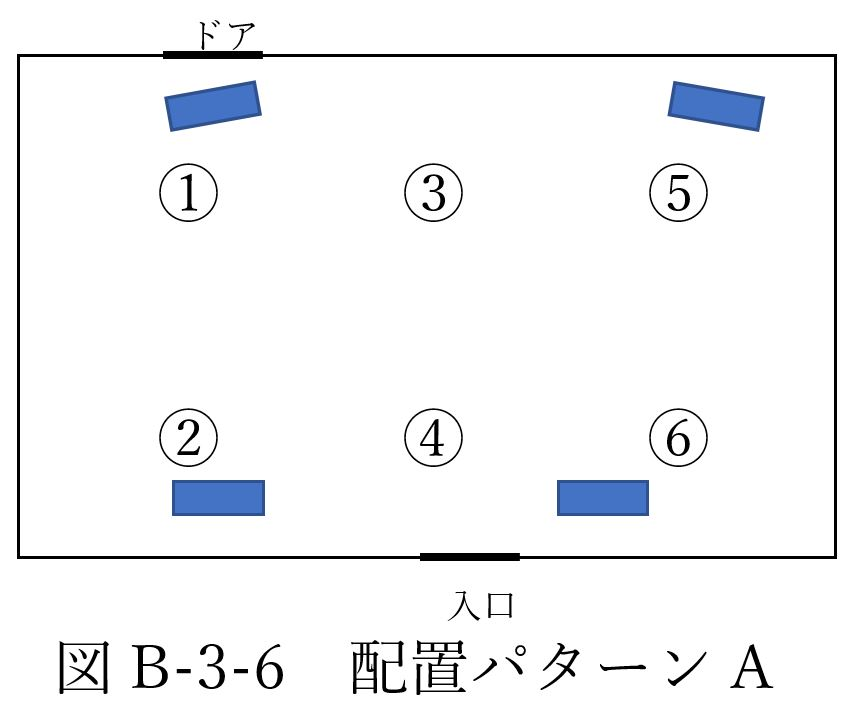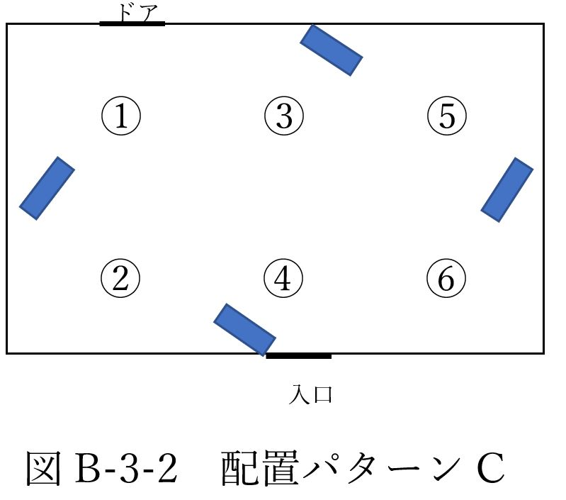 今回の測定データからは配置パターンAが体感温度を下げるのに最適であると判明した。また、送風機を向かい合うように設置して空気の通り道を作る事が大切であるとわかった。