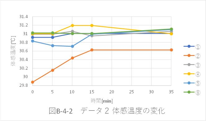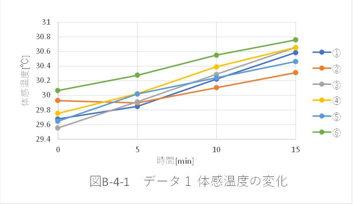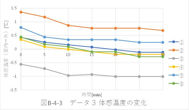 ・全位置におけるデータ8,9,10,11は、体感温度が測定位置によって大きく異なった。これらのデータは、天気の良くない日(曇天)に測定したという共通点がある。表B-2-1より、晴天時に実験を行ったデータ3~5と、曇天時に実験を行ったデータ8~11を比較する。室温はあまり変化がなかったのに対し、外気温が約9℃低かった。従って、気温が低いときの方が、体感温度に大きい差が出ると考えられる。