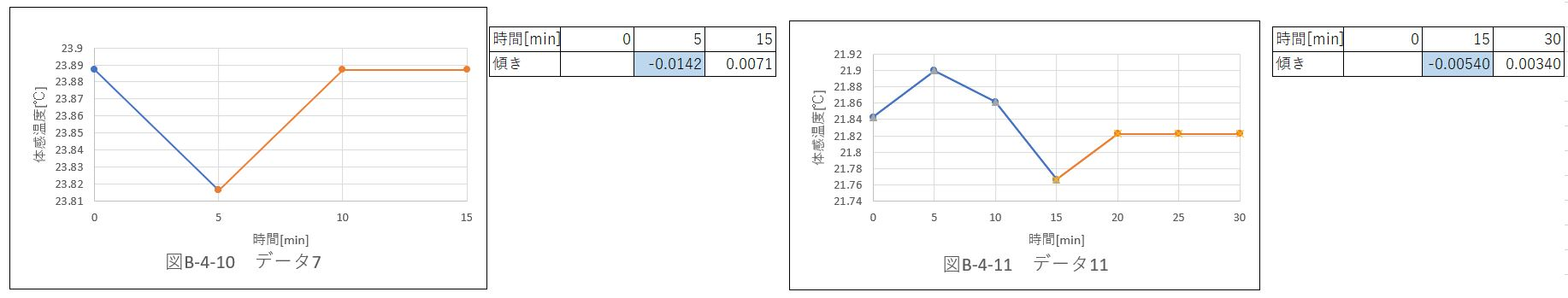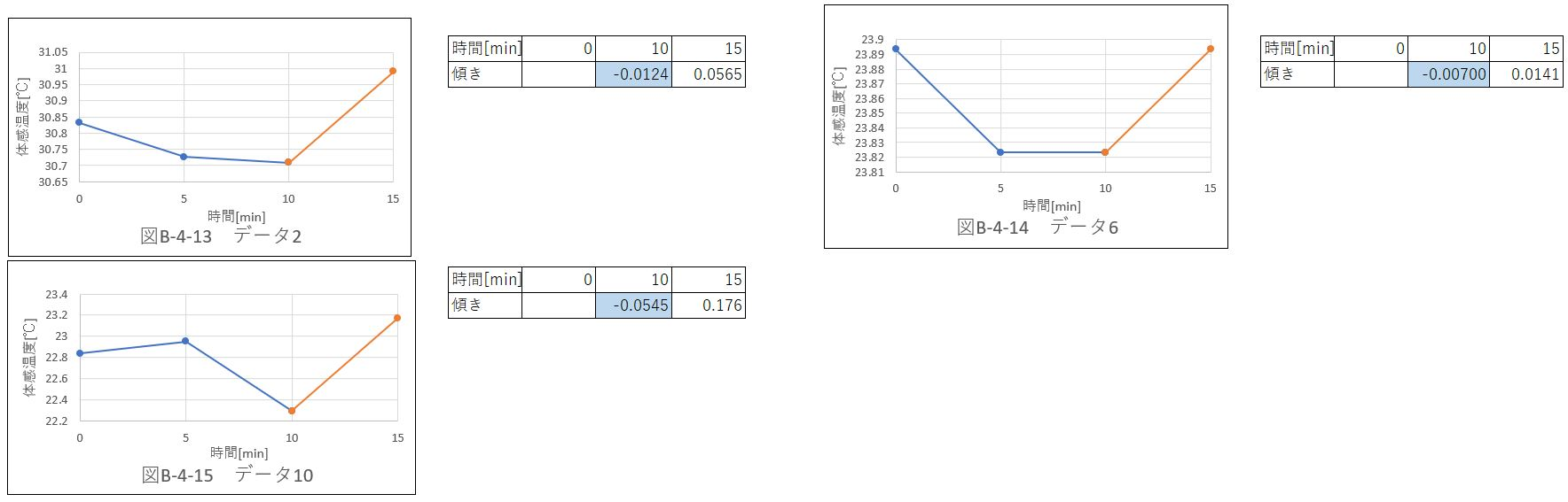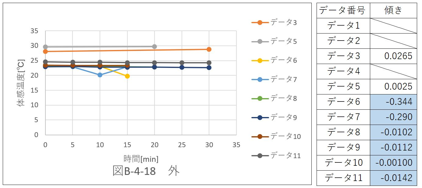 体育館内での体感温度変化と比べて、傾きの絶対値が大きいデータが多かった。これは、風速が安定していないこと、天気によって温度、湿度が変化することによる。