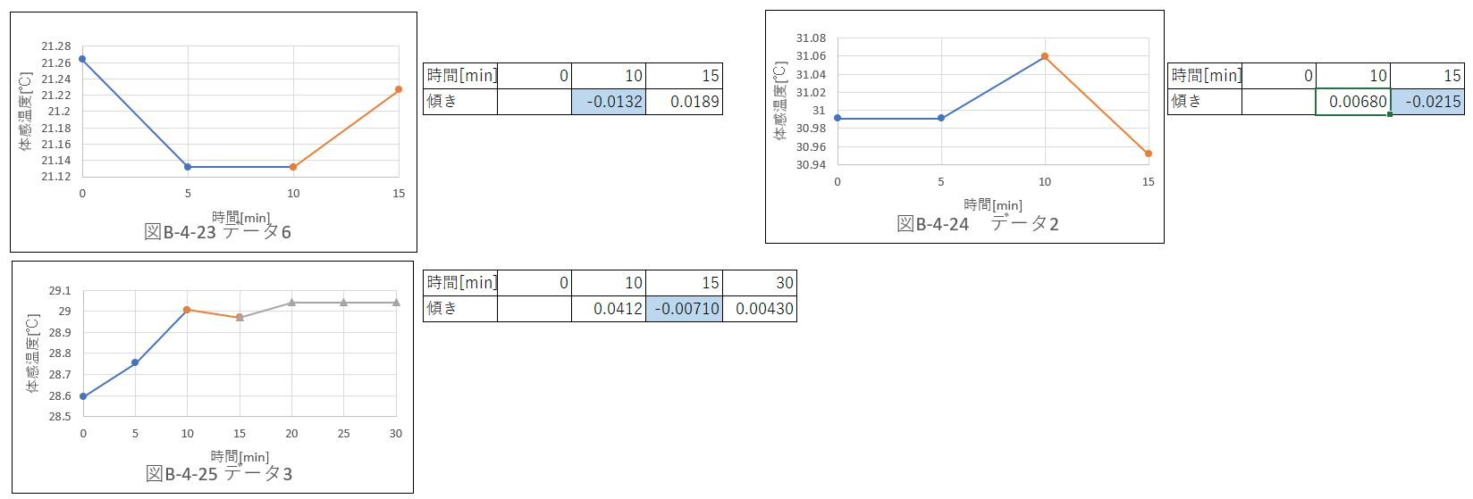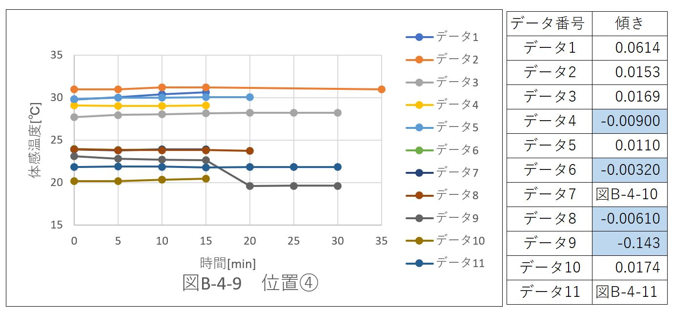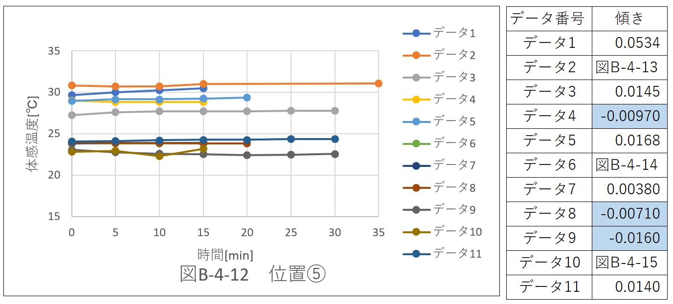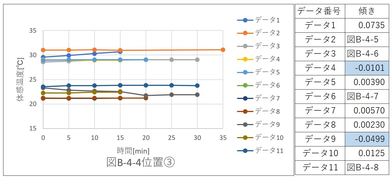配置パターンのデータを体感温度で比較し、グラフの傾きを算出した。位置ごとにデータをまとめた。