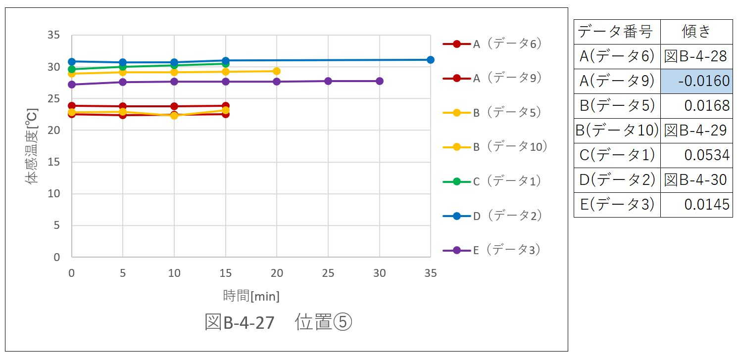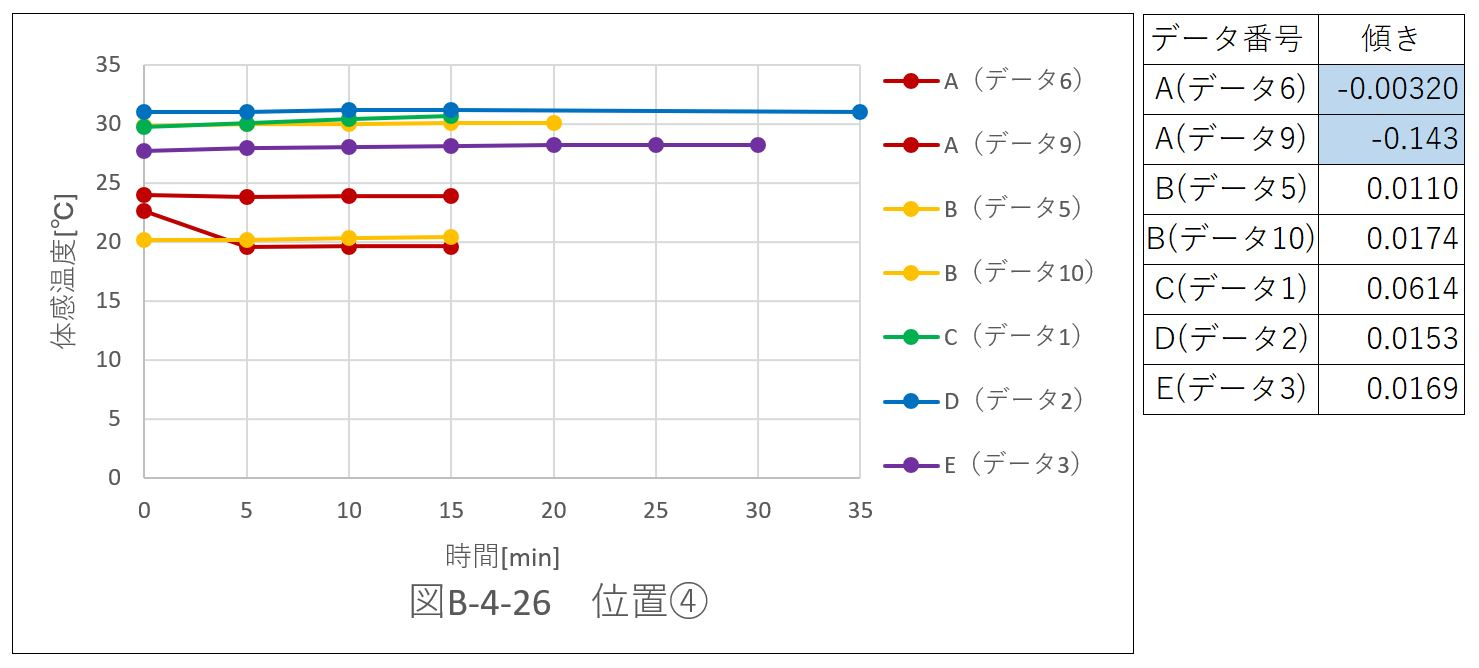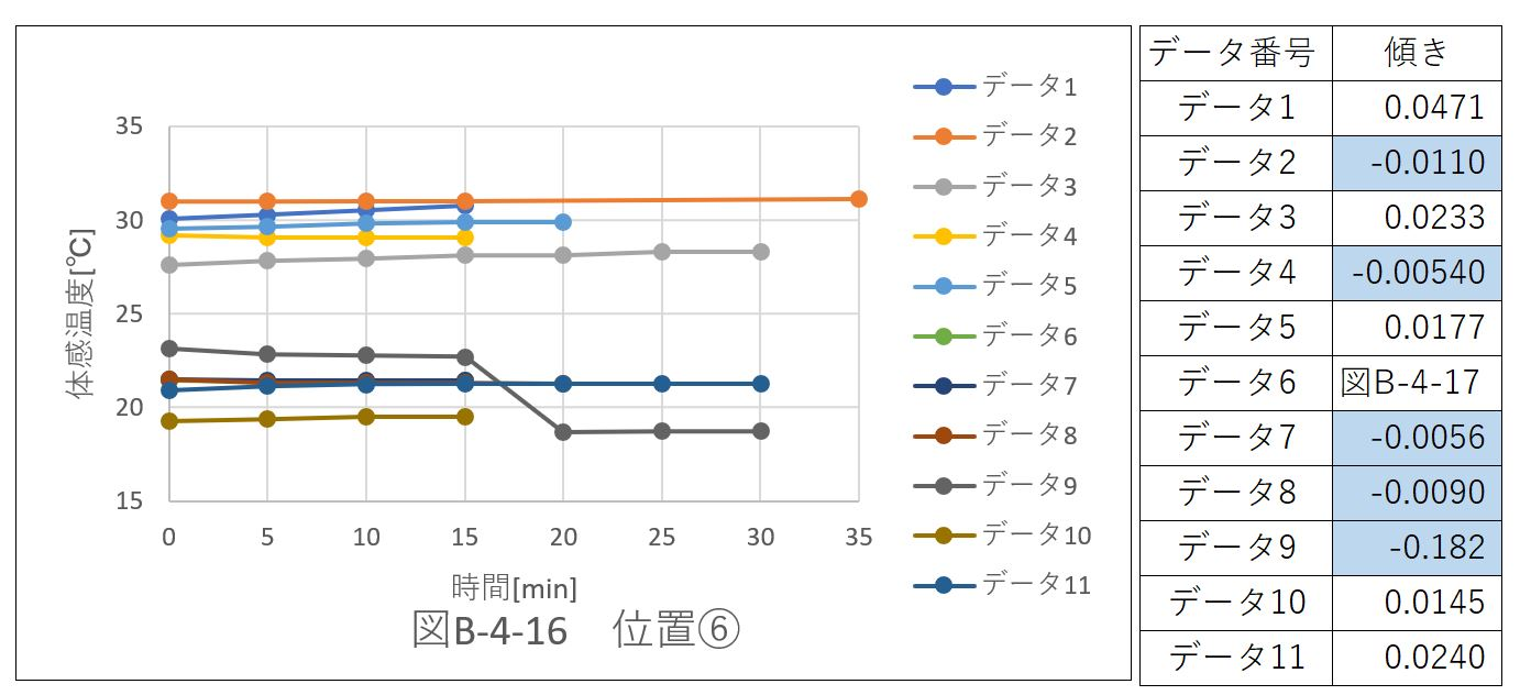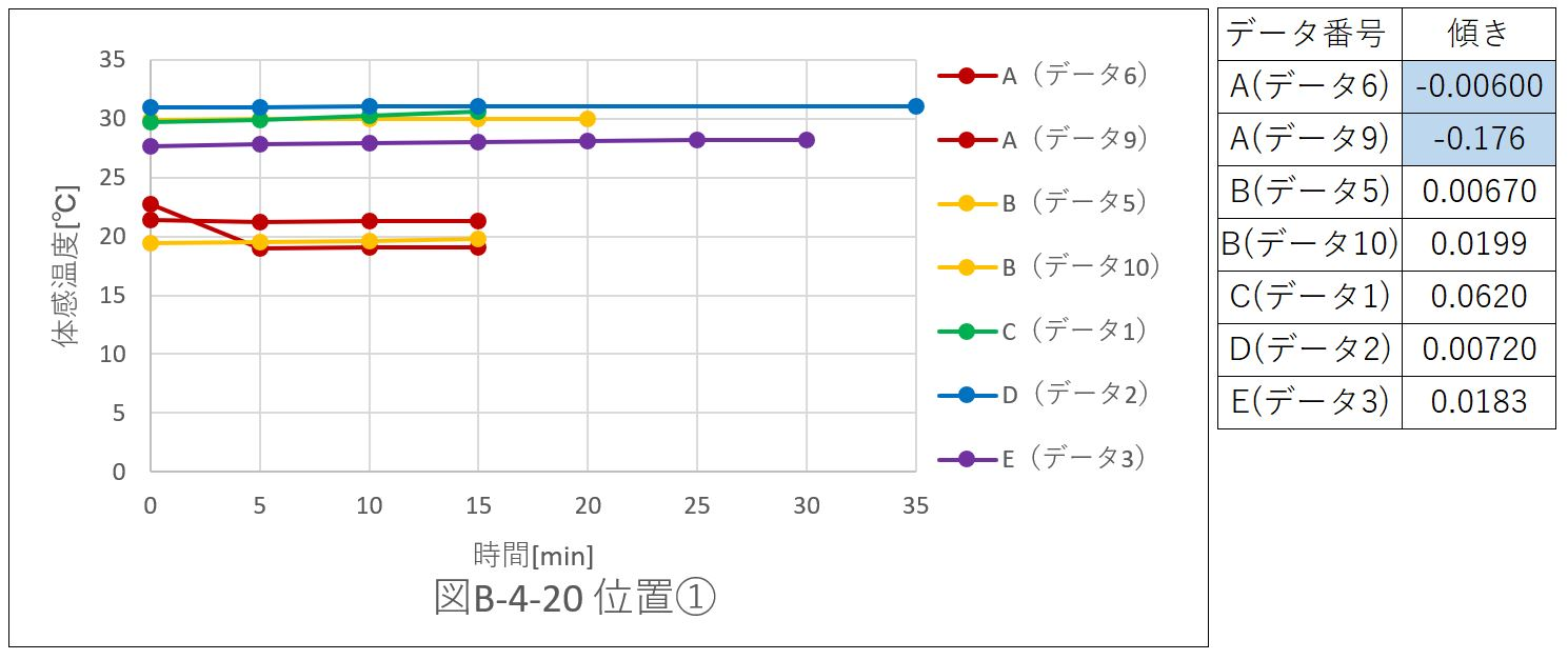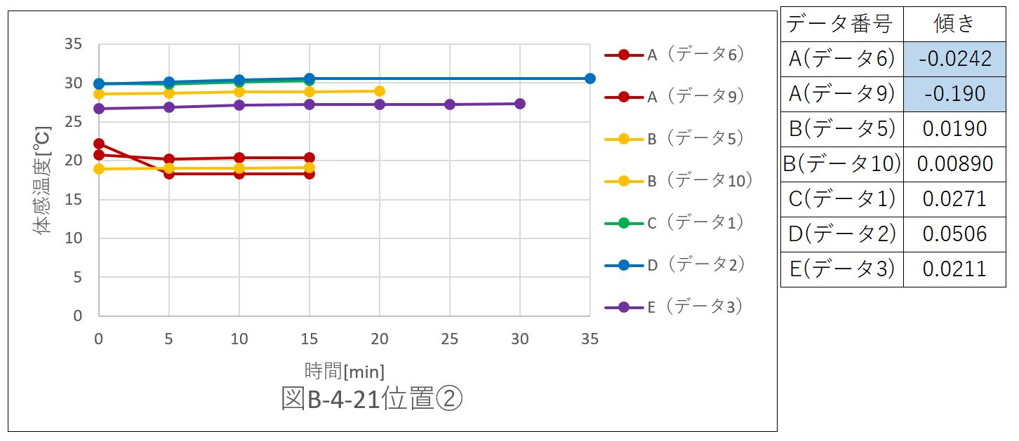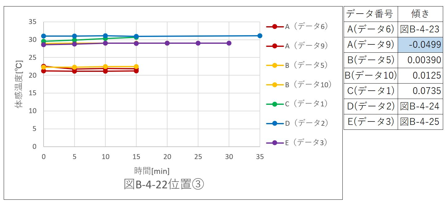 正負の傾きを両方持つデータはなかった。つまり、体感温度は、上昇するのみかもしくは減少するのみの、いずれかの変化を示している。このことより位置@では空気の流れの変化がないと考えられる。