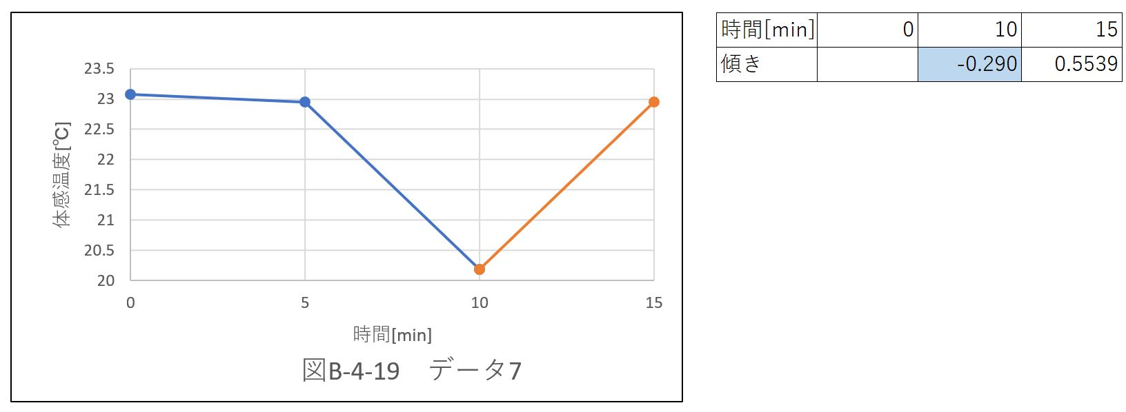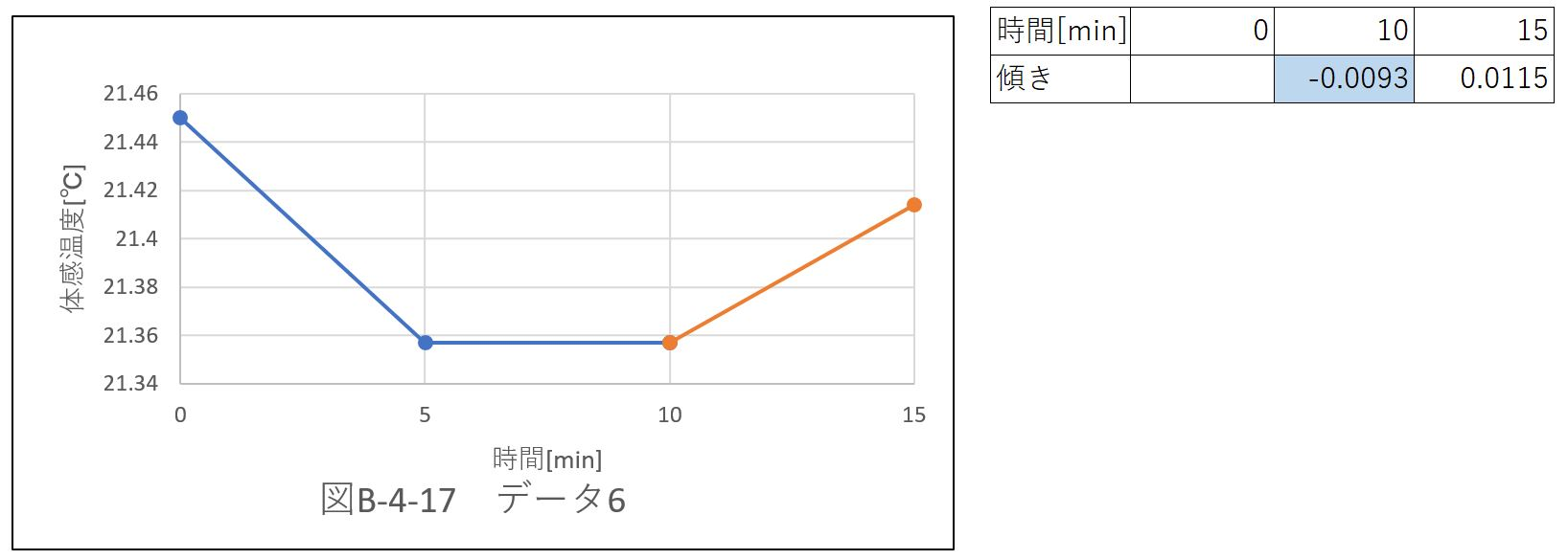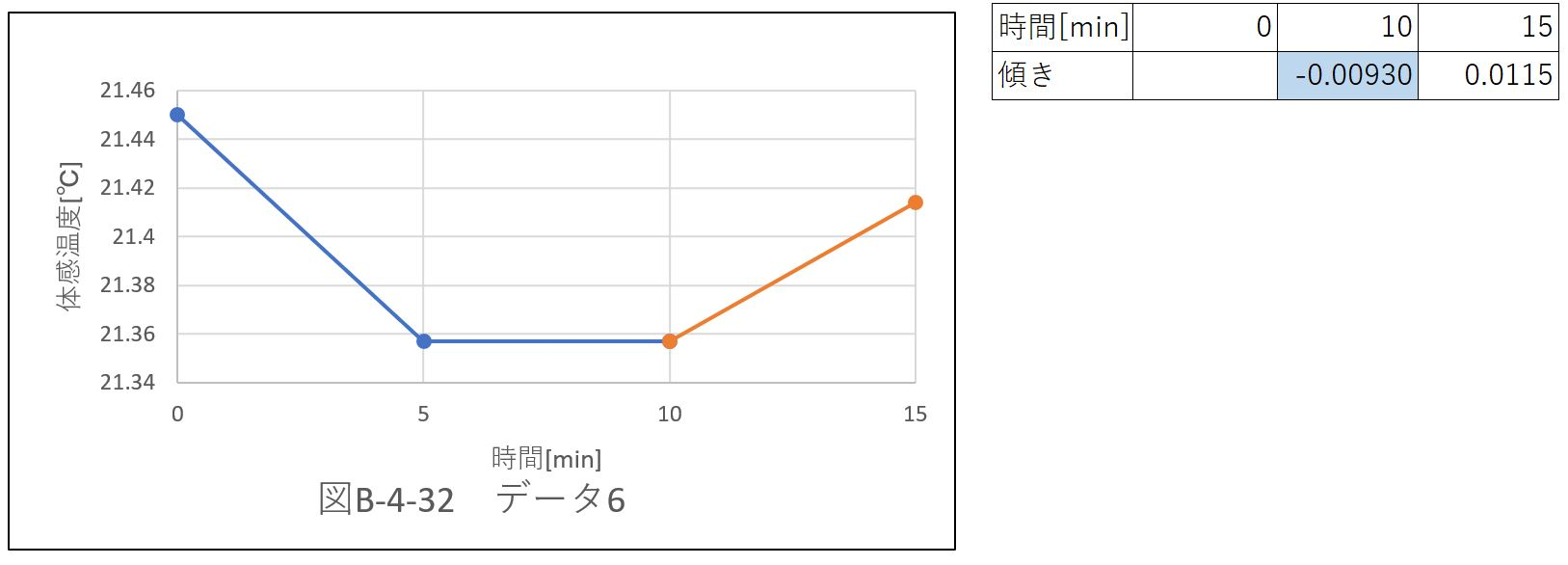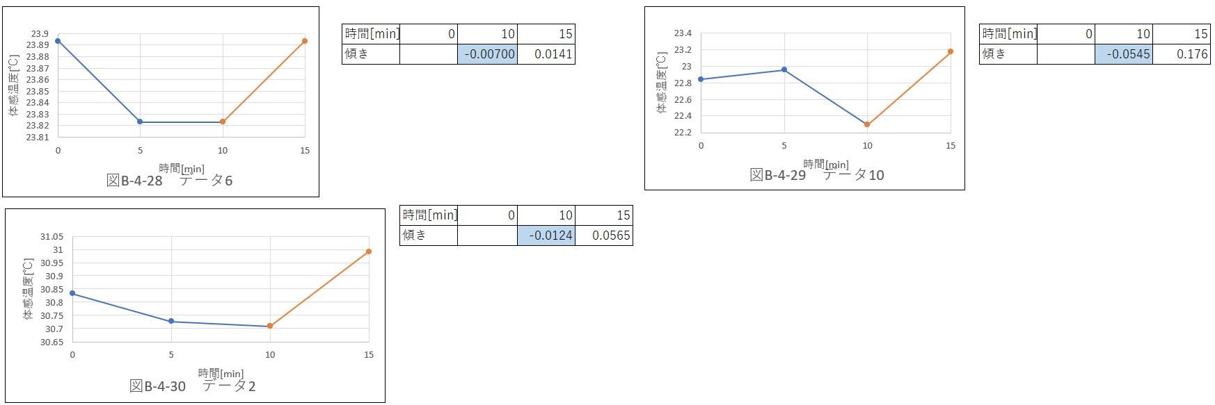 負の傾きを持つデータは6個あり、位置@〜Eの中で一番多い。保冷剤による冷気により、”データ7”の傾きは負を持った。