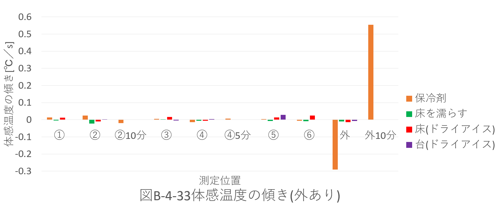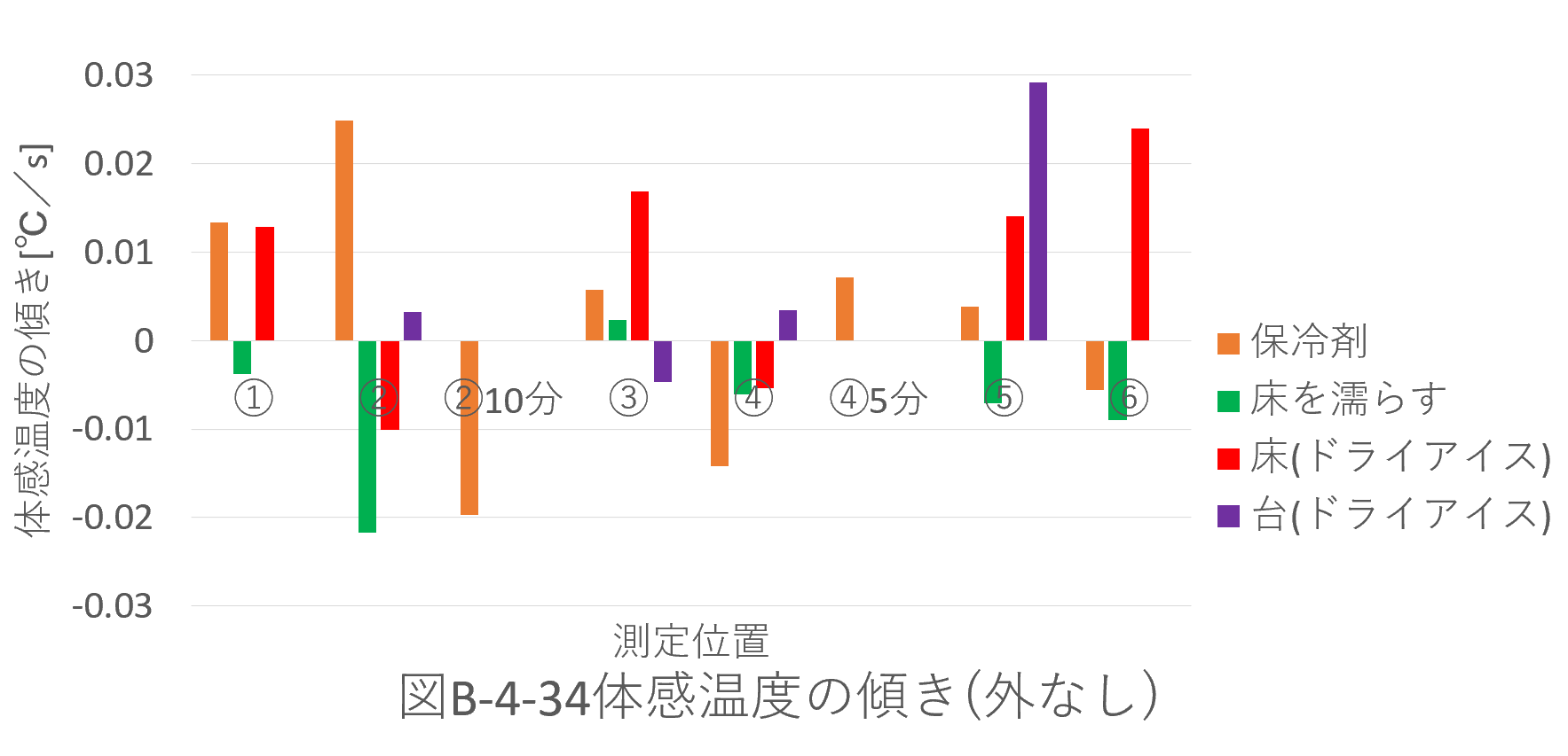 ・データの傾きの絶対値を比較すると、傾きと位置に相関が見られなかった。このため、体感温度の変化の大きさは位置によらないといえる。