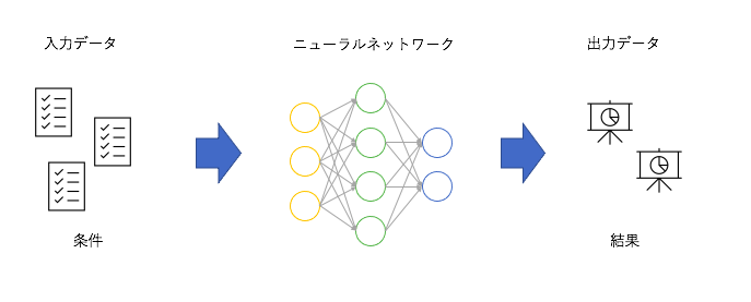 過去に蓄積された、どのような条件の時にどのような結果になったかというデータを元にして、条件から結果を予測し学習します。そして予測時には学習したニューラルネットワークを利用して、もしこのような条件であれば結果はきっとこうなるだろうという予測を行います。