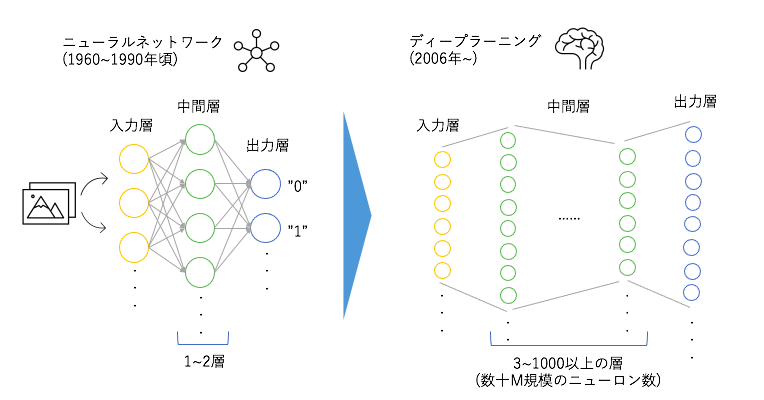 ディープラーニングというのはニューラルネットワークの層の数を多層にしてニューロンの数が非常に多い形をしていて、大規模な学習と高い性能が期待できます。