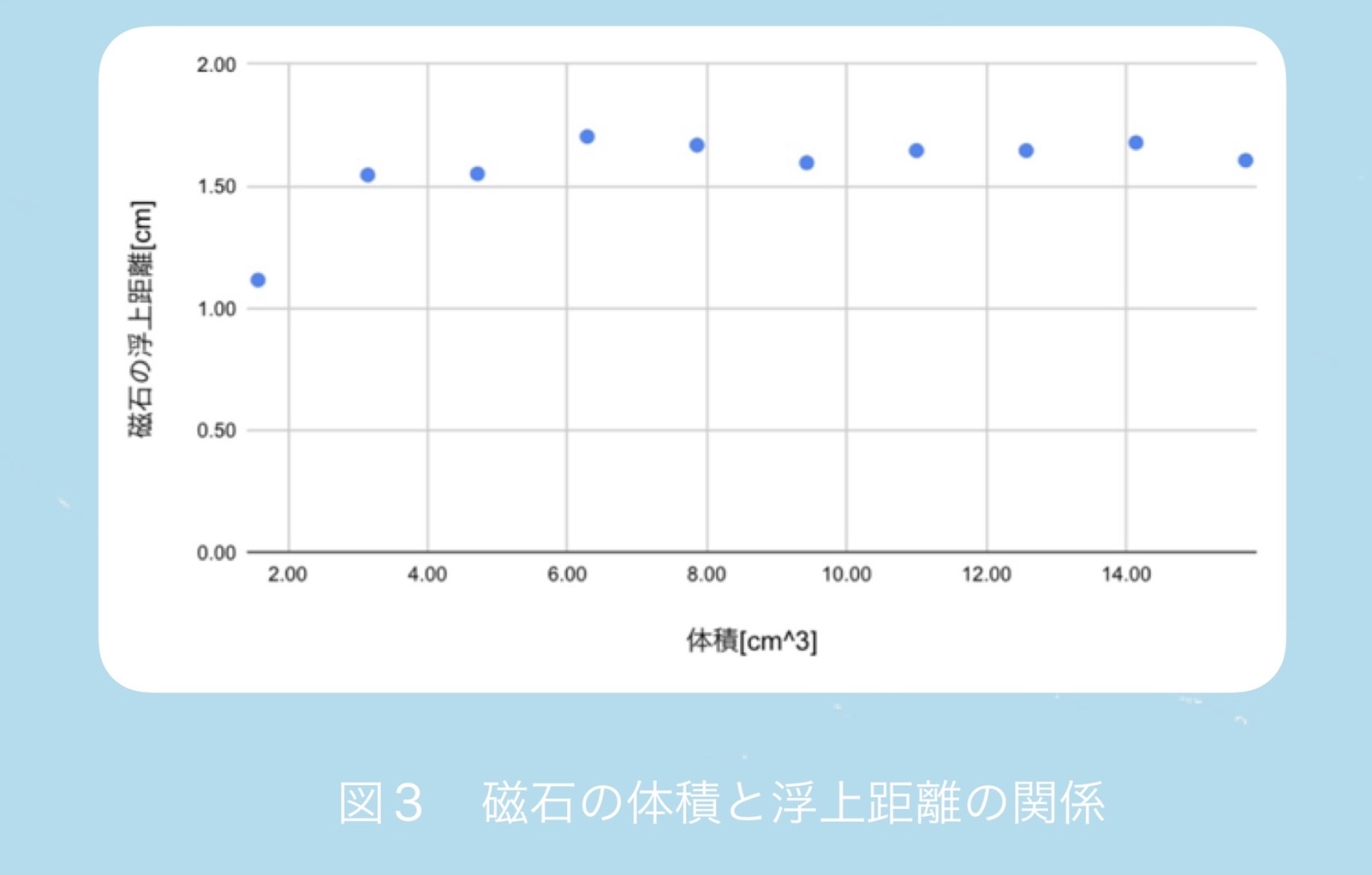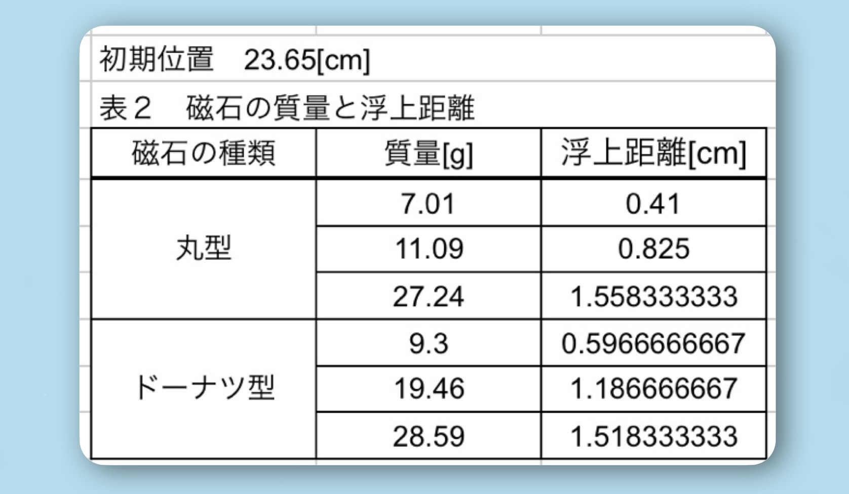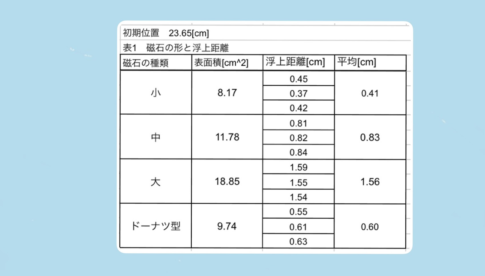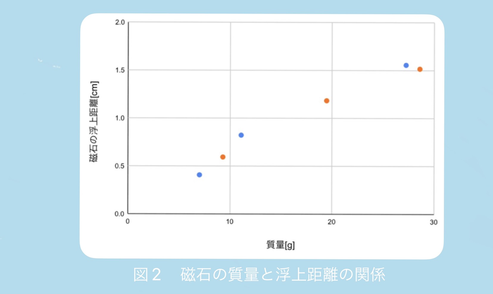 結果にばらつきはありましたが、質量が大きくなると浮上距離は大きくなりました。