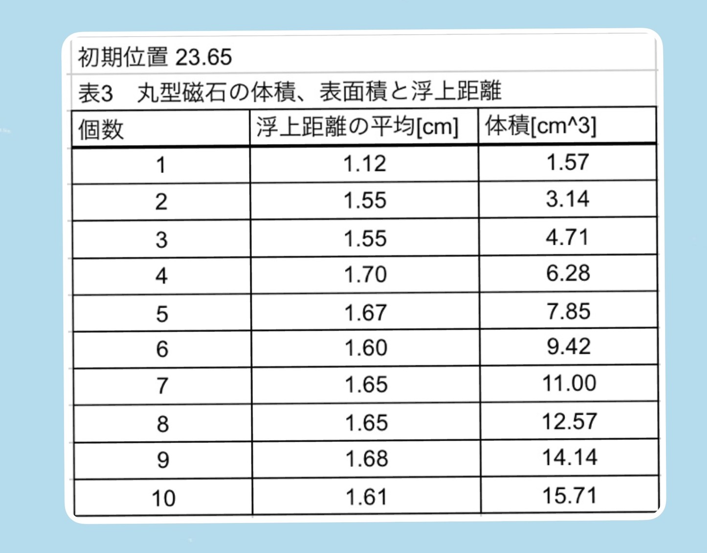 同じ形の磁石を1~10まで個数を変えて、それぞれの浮上距離を測定しました。