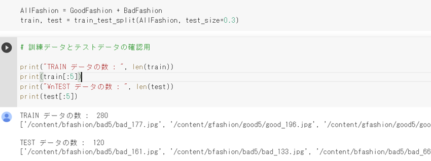 GoodもBadもまとめたリストAllFashionを作成し、訓練データとテストデータに分類しました。