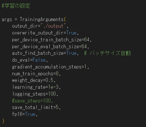 手順1で事前学習させたモデルに対して、トークン化を行った後に以下の変数を用いてFine-Tuningを行いました。