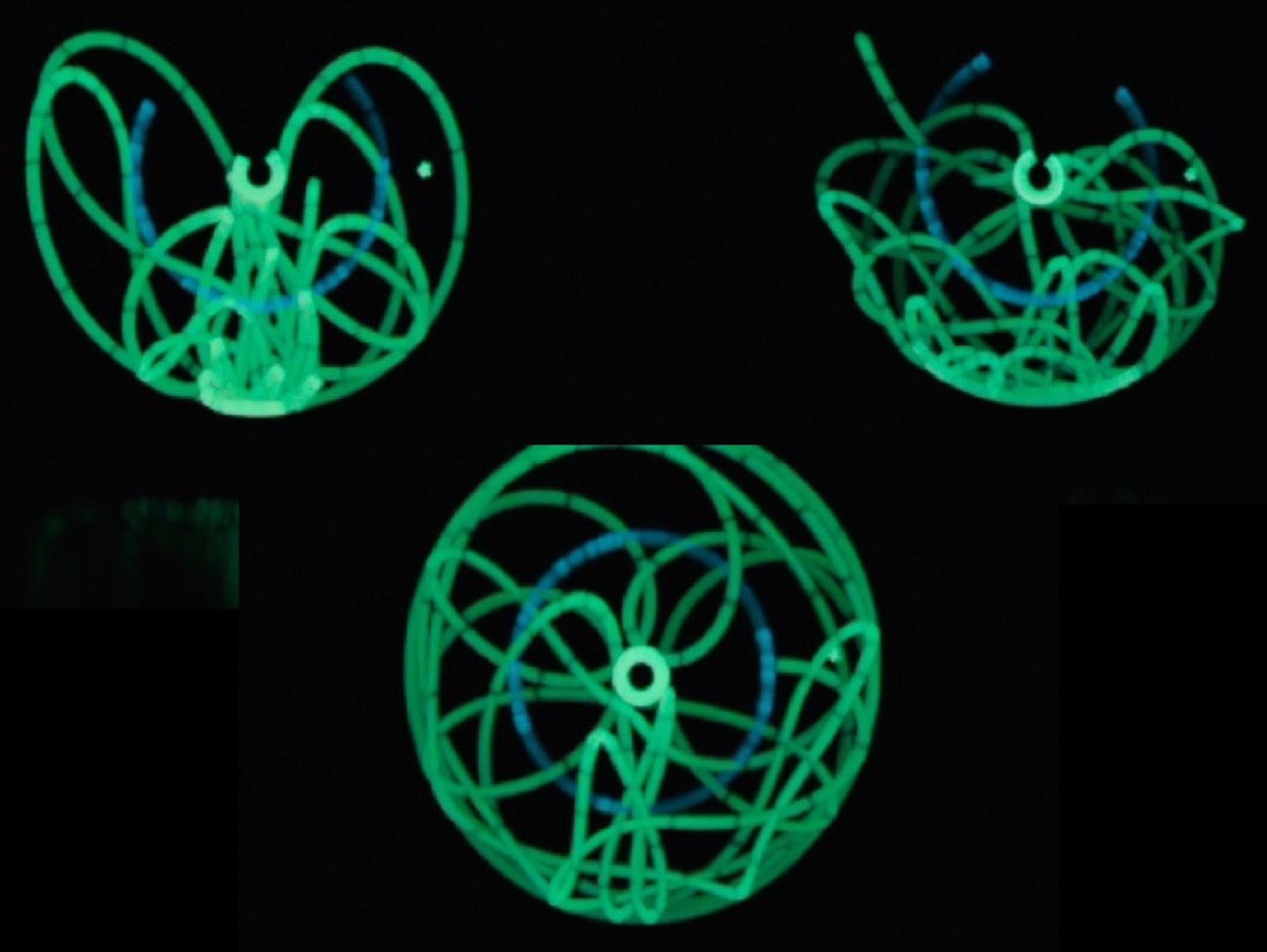 ・回し始める位置のわずかな違いで、描かれる軌道が大きく変化し、二度と同じ軌道は見られないことを確かめることができた。