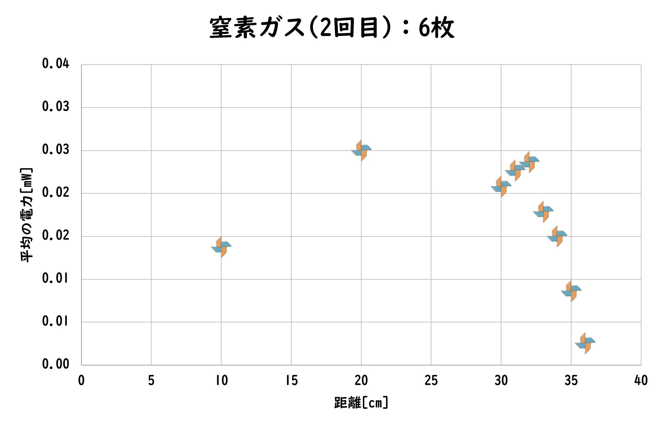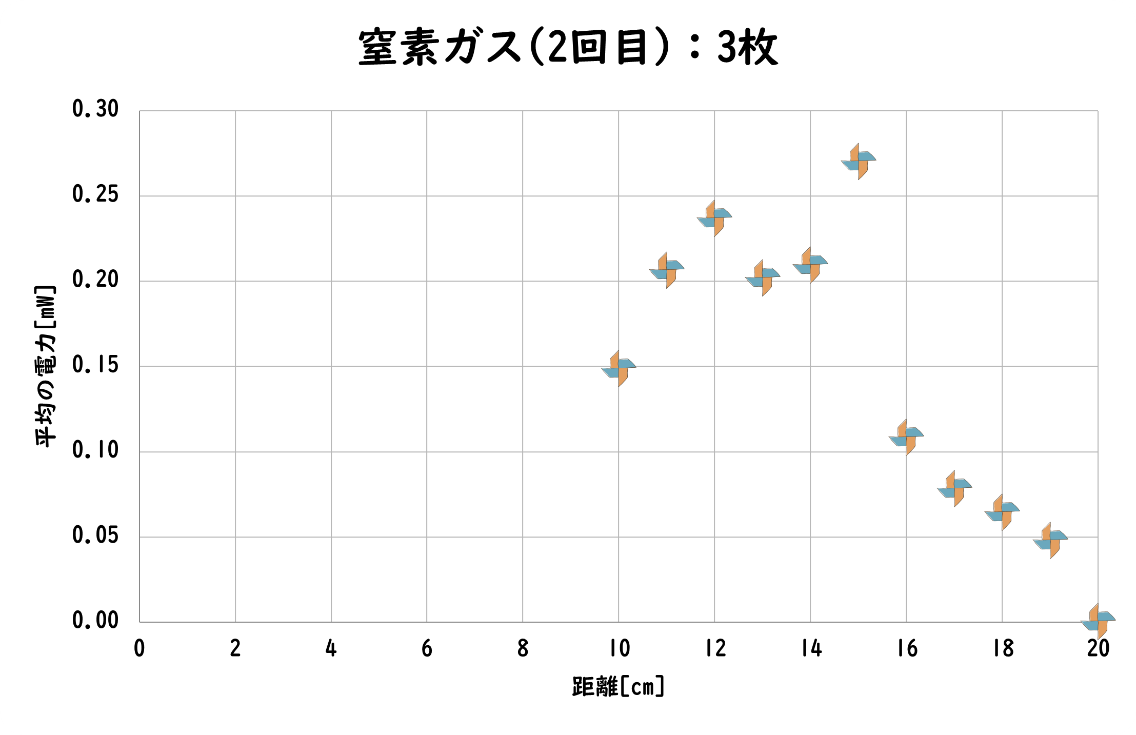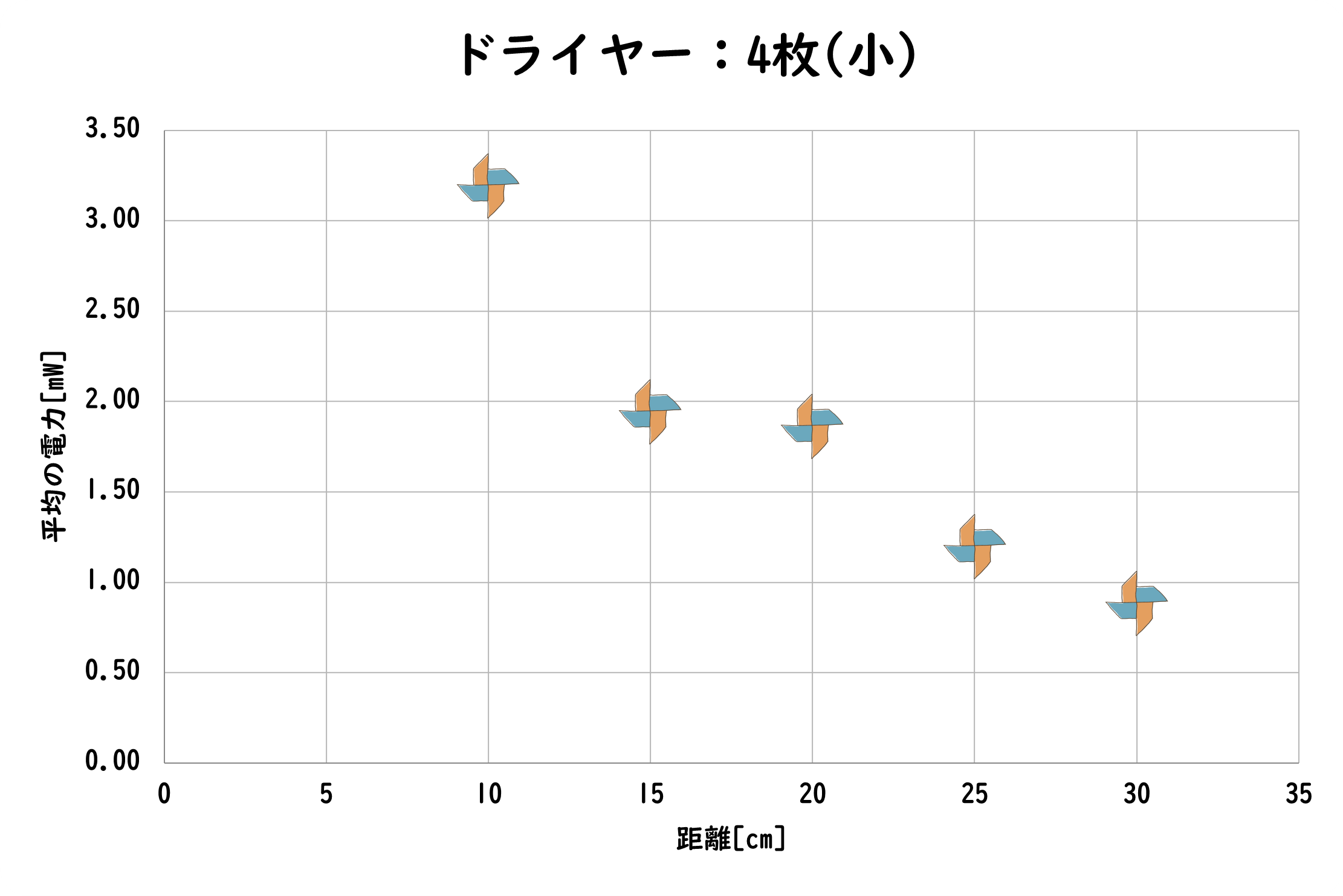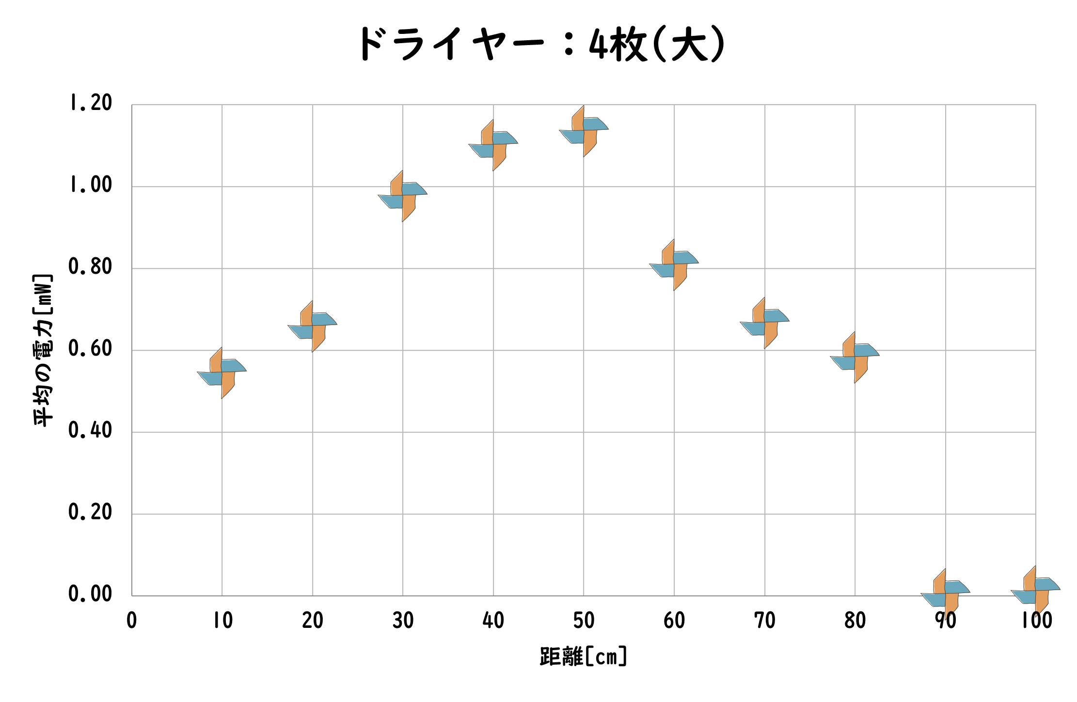 ドライヤーを用いて、距離を変化させて測定を行った。しかし、かざぐるま4枚羽、4枚羽(小)の場合でしか、回転しなかった。