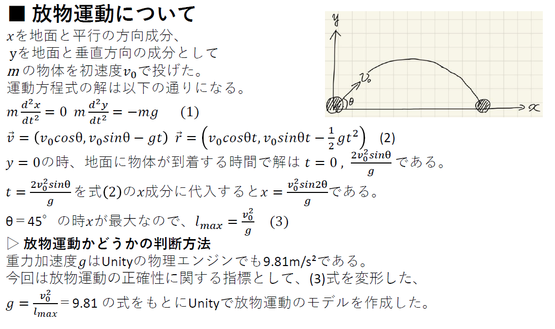 モデルの正確性の指標として、重力加速度が含まれている放物運動の数式を使用しました。