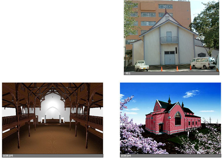 現存する建物は1914年4月の天井からの出火、 1923年の関東大震災などを経て翌1924年に修復されたものである。修復工事は内部の造作は変えず、 外部の煉瓦壁を取り除き木造壁にするものであった。 内部の木造トラス、ステンドグラスなど、部材は創建当時のものであり当初の姿がよく保存されている。