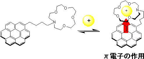 この相互作用を溶液中でも溶媒和やその他の環境要因の存在下においても十分働くことを調べるために、アザクラウンエーテルとピレン環をつないだ化合物を合成し各種のスペクトルからカチオンを取り込むとクラウン部分が芳香環の上に重なることを支持する結果を得た。