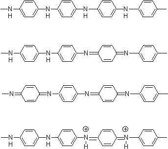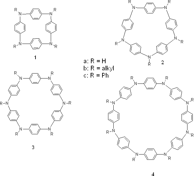 トリフェニルアミン有機EL材料のホール注入材料として注目されています。一方、N,N,N’N’-tetramethyl-p-phenylenediamine (TMPD)は容易に酸化され、Wurster radicalとして古くから知られる安定なラジカルを形成する事で有名です。また、ポリアニリンは古くはアニリンブラックとして染料に、現在では導電性高分子材料として注目されています。すなわち、ポリアニリン自体は無色で絶縁性ですが、酸化すると酸化段階によっていくつかの形になり(下図)特にエメラルディンベース(酸化型)にプロトンをドープしたものは導電性を示す物質です。これらは直線上の高分子ですが、必ず分子には「端っこ」があるはずです。もしこの高分子の構成単位を環状構造にしたら端のない閉じた系ができますがこのときにどのような性質が生まれるのかを研究対象にしています。下の図の分子は:R =Hのときポリアニリンの環状体になり、R = MeのときWursterラジカルの環状体の還元型です。R = Phになればトリフェニルアミンの環状体です。このように置換基を変えることで様々な性質を観測できる化合物群です。これらの合成法の開発をまず確立することが第一の仕事です。