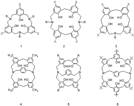 1:Hexahomotriazacalix[3]arene または Triaza[3.3.3] 2: Tetrahomodiazacalix[4]arene または DIaza[3.1.3.1] 3: Homoazacalix[4]arene または Aza[3.1.1.1] |