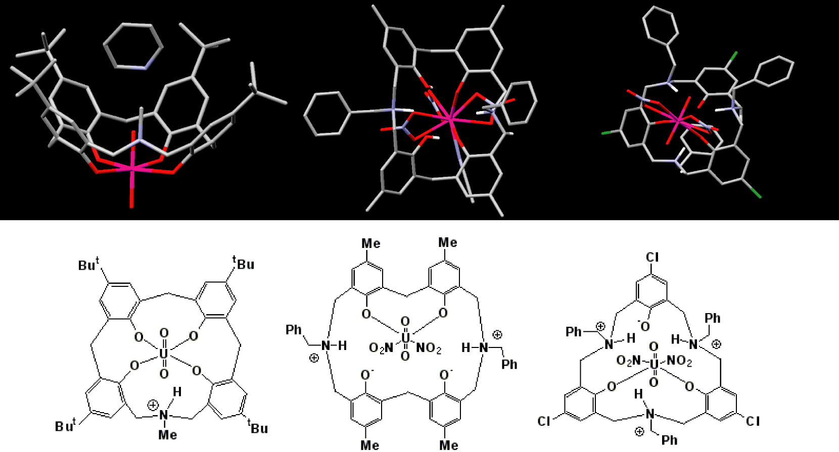 Azacalixarene類のウラニルイオンの錯体の構造です。このほかにもLanthanide錯体の構造も明らかにしました。