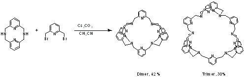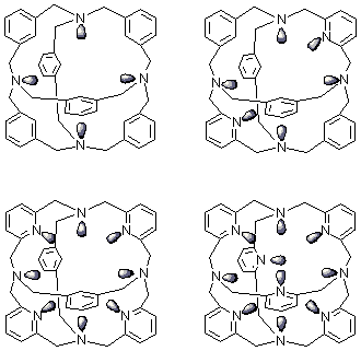 ベンゼン環やピリジン環を含む各種誘導体を合成した。ピリジン環が4枚以上になると強い塩基性とカチオン捕捉能を持つようになる。 また酸性溶液中では塩素イオンに選択的なホストになる。銅や銀イオンと非常に安定な錯体を形成し、たとえば銀錯体では強い光やハライドイオンを作用させても変化しない。 |