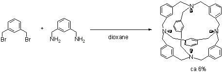 かご型化合物の結合異性体であるDimer(図)は別のルートで合成された。Dimerはグアニジニウム塩、尿素を包接する。また水分子を6〜7分子取り込む。 |