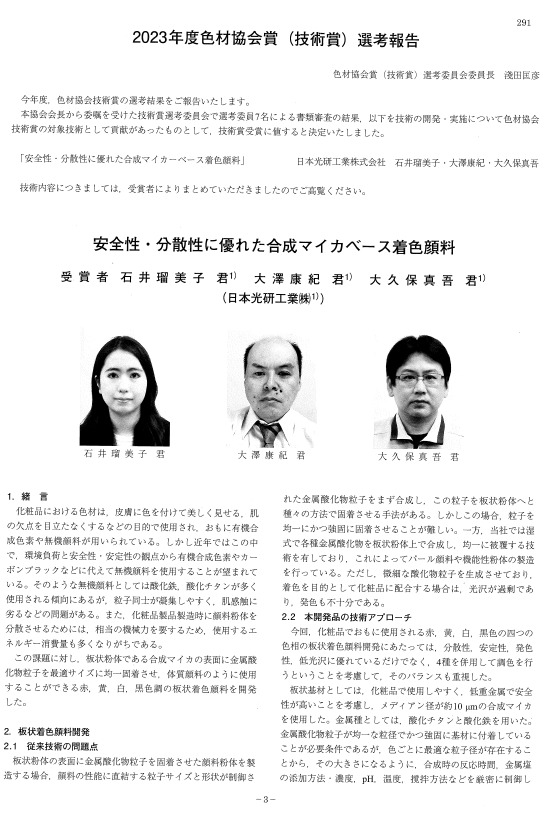 当研究室の2019年度修士修了の石井瑠美子さんが、勤務先の仕事に関連して色材協会賞(技術賞)を受賞されました。おめでとうございます。当研究室の研究内容とは異なりますが、卒業後も研究開発職としてご活躍であることは大変喜ばしいことです。さらなる発展を期待しています。
