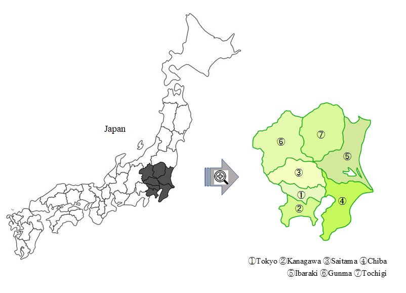 In the light of the above, we examined the current states of cardiometabolic diseases and other conditions* and the underlying mechanisms. In this NDB-K7Ps Study, we investigated the data of the NDB (about specific health checkups and related health-care data) in the seven prefectures (Tokyo, Kanagawa, Saitama, Chiba, Ibaraki, Gunma, and Tochigi) of Japan’s Kanto region (Figure 1). Figure 2 indicated the percentage of medical checkups in Japan and Kanto region.