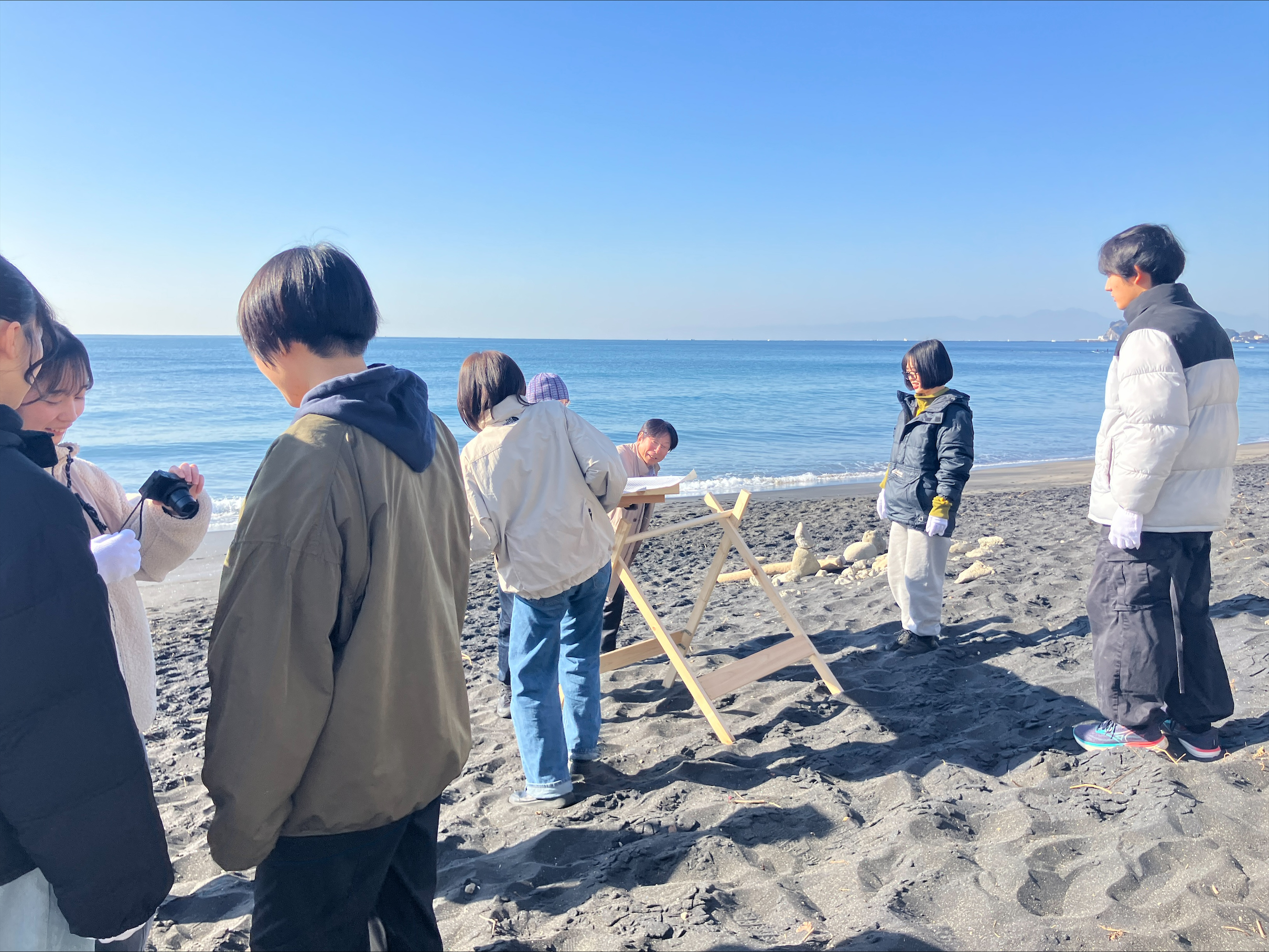 神奈川県の稲村ケ崎、千葉県の飯岡の砂浜に砂鉄を取りに行きました。砂鉄を採集するための装置も手作りし、大量に採集することができました。鉄が磁石につく様子は、ウニのよう…。ここからさらに手作業で不純物を取り除いていきます。