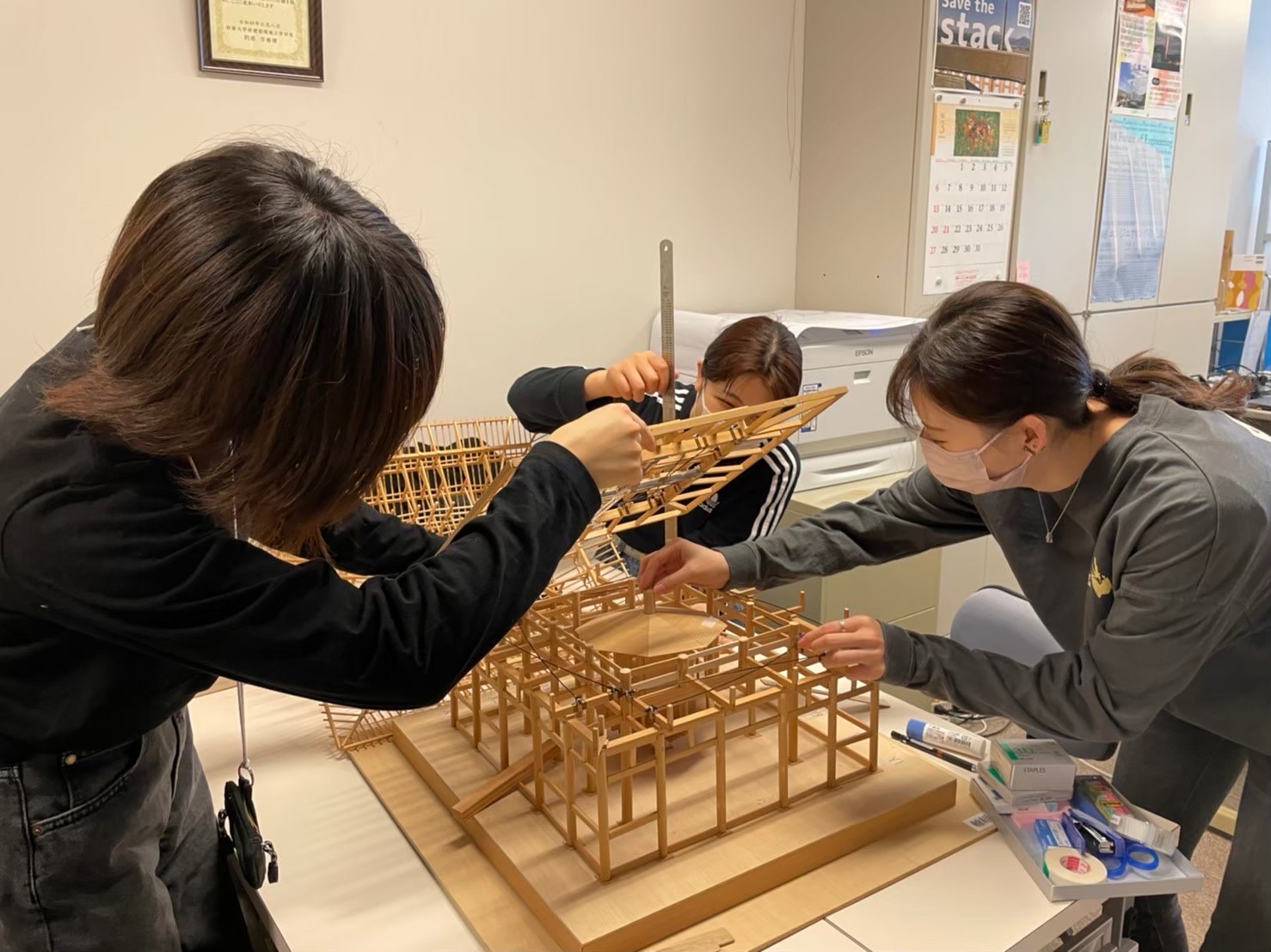 今まで使われていた部材、新たに追加した部材を水平垂直に組み合わせるのはなかなか難しかったですが、軸組にて作成したため部材名称の詳細や補強部位について体感して学ぶことができました。