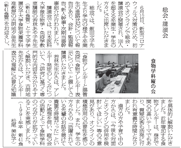総会では、飯田文子教授が研究室からリモートで、学内の様子や卒業生の進路状況についてお話しくださいました。その後の会計・監査報告、新人幹事・次期当番幹事紹介もリモートで行われました。