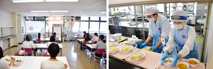 6月3日(金)から7月6日(水)まで、6週間にわたり水曜日および金曜日に全10回の「給食経営管理実習」での食事の提供が行われました。この科目は食物学科 管理栄養士専攻3年の必修科目であり、医学団体のコンソーシアムが認証した健康増進を目的とした「スマートミール(ちゃんと)」の基準に従い献立を作成。さらに調理工程の検討、当日の調理、HACCPに基づく衛生管理までを学生自らが行い、学内の教職員を対象に昼食を提供しました。