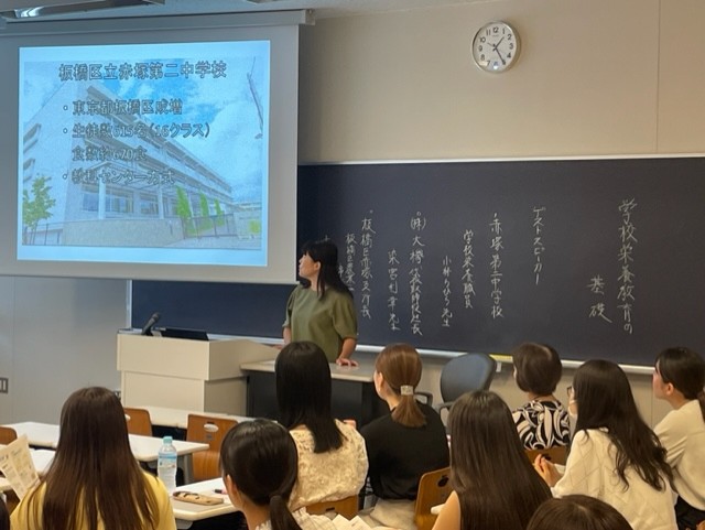 授業では板橋区で学校給食における地産地消に取り組まれている学校栄養職員、都市農家、区の農業委員会からのゲストスピーカーの先生方のご講演後、学校給食などに携わっている卒業生17名も交えたディスカッションを行いました。実践の場での生の声を聞き、栄養教諭を目指す学生にも卒業生にも学びの多い時間になりました。