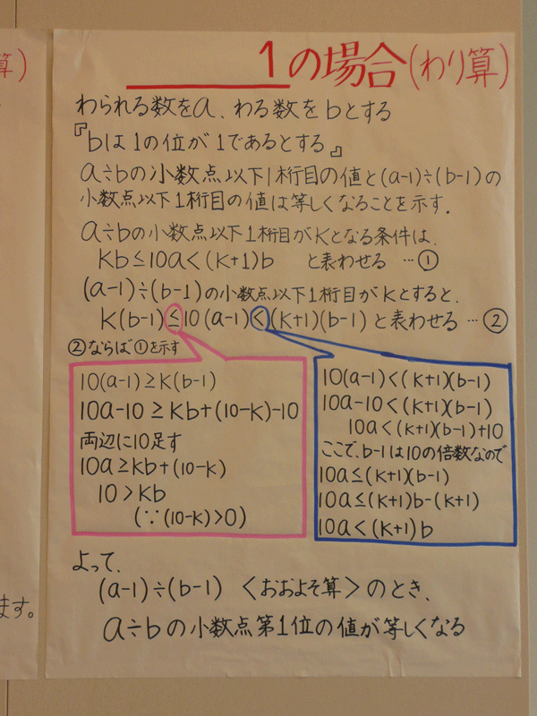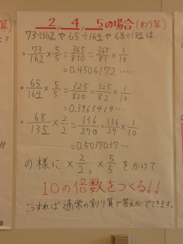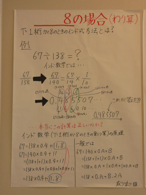 「インド式」と言われる割り算の方法を本で調べ、 その仕組みの説明を試みました。 遊びに来て下さい。 (なお、この計算方法がインド発祥であるかどうかについては私たちには分かりません。 今回の発表の趣旨は計算方法が正しいことを確認したことです。)