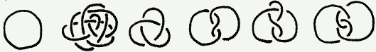 結び目とは3次元空間の中の絡まった輪っかのことです。図1のように完全に平面上にのる輪っかは自明結び目と言います。交差が無く、ほどけています。図2は複雑な結び目に見えますが、実はほどけます。太めの柔らかいひもで実験してみて下さい。図3と図4は異なる結び目に見えますが、実は同じ結び目でして、三つ葉結び目と呼ばれます。図3の左下の葉っぱのひもをつまみ上げて右側に移動させると図4になります。図5と図6は8の字結び目で、同じ結び目です。結び目は無限個の種類があります。三つ葉結び目や8の字結び目はほどけないのですが、どうしたらそんなことが証明できるでしょうか?
